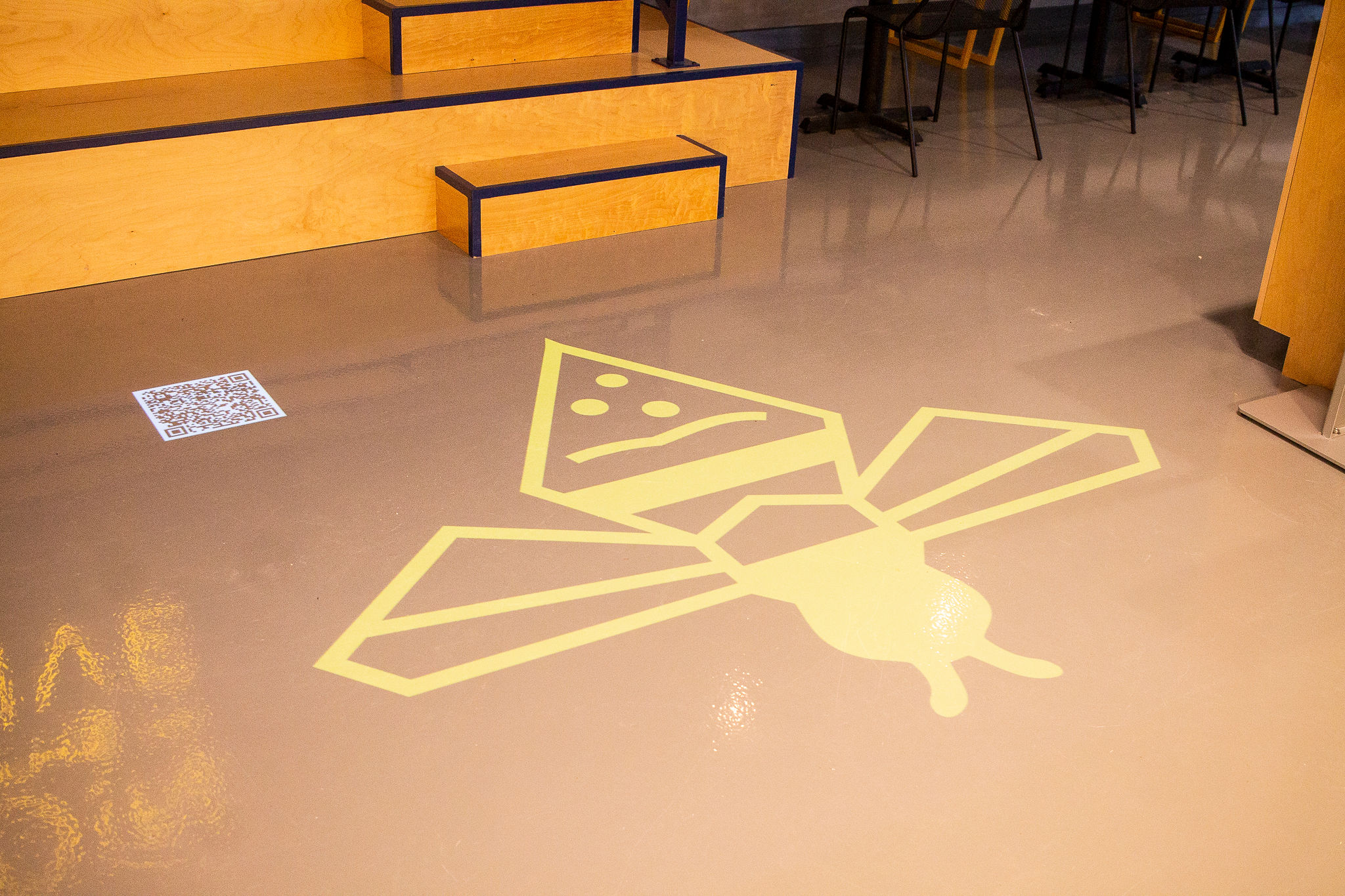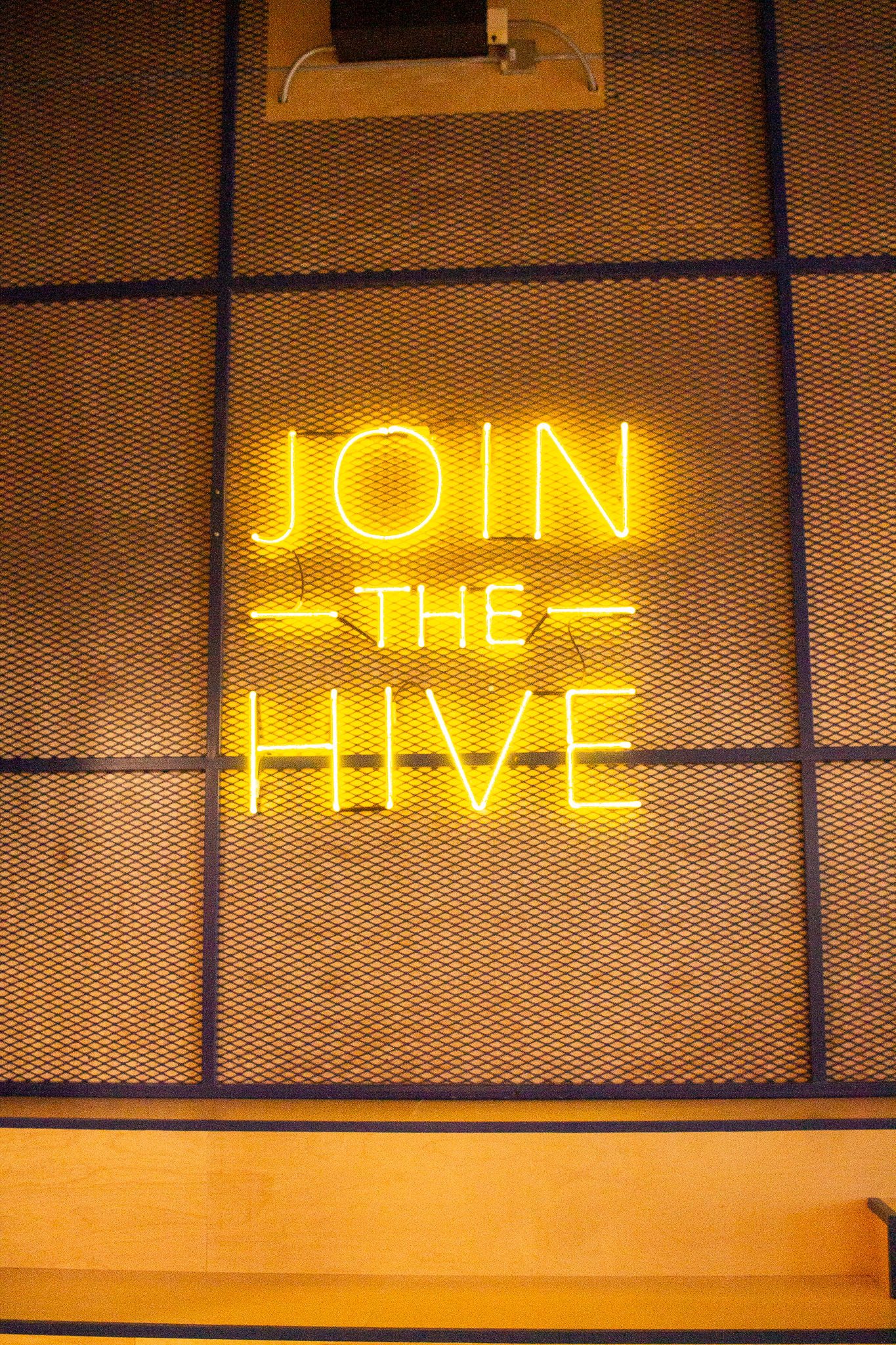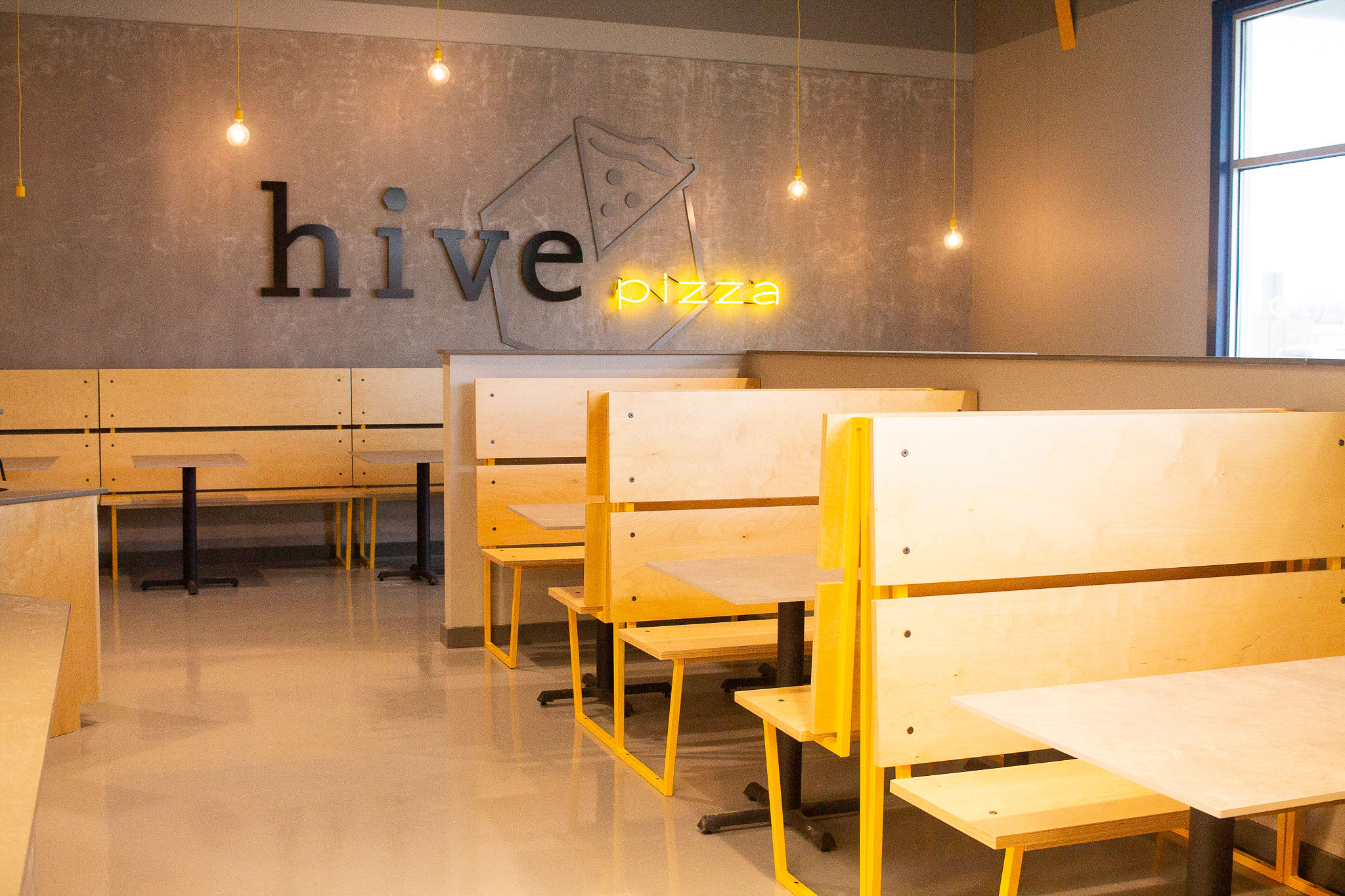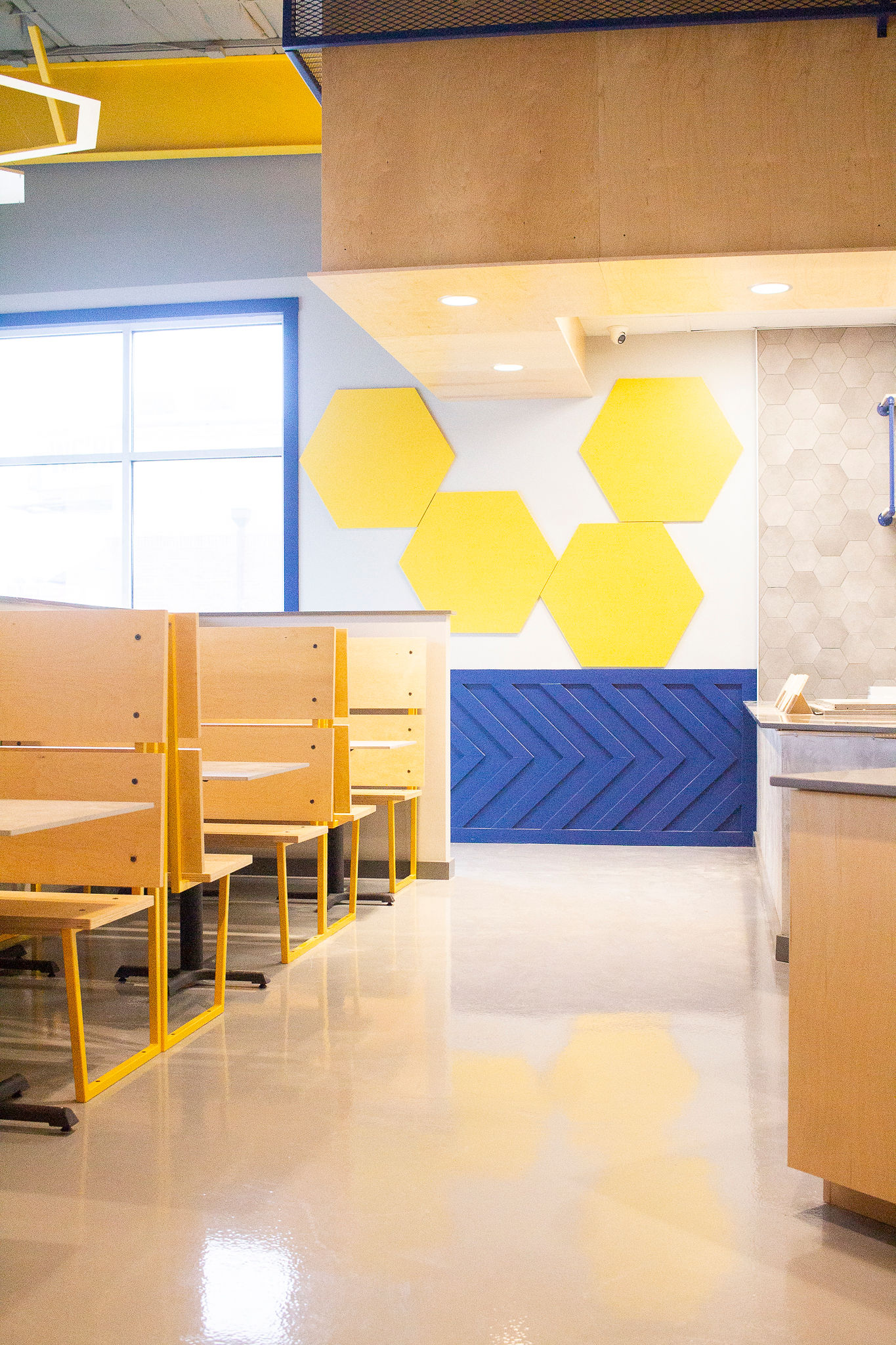 Inside the modern-industrial restaurant, hexagon-shaped tile and light fixtures, yellow neon lights and bumblebee illustrations on the floor nod to the hive theme.