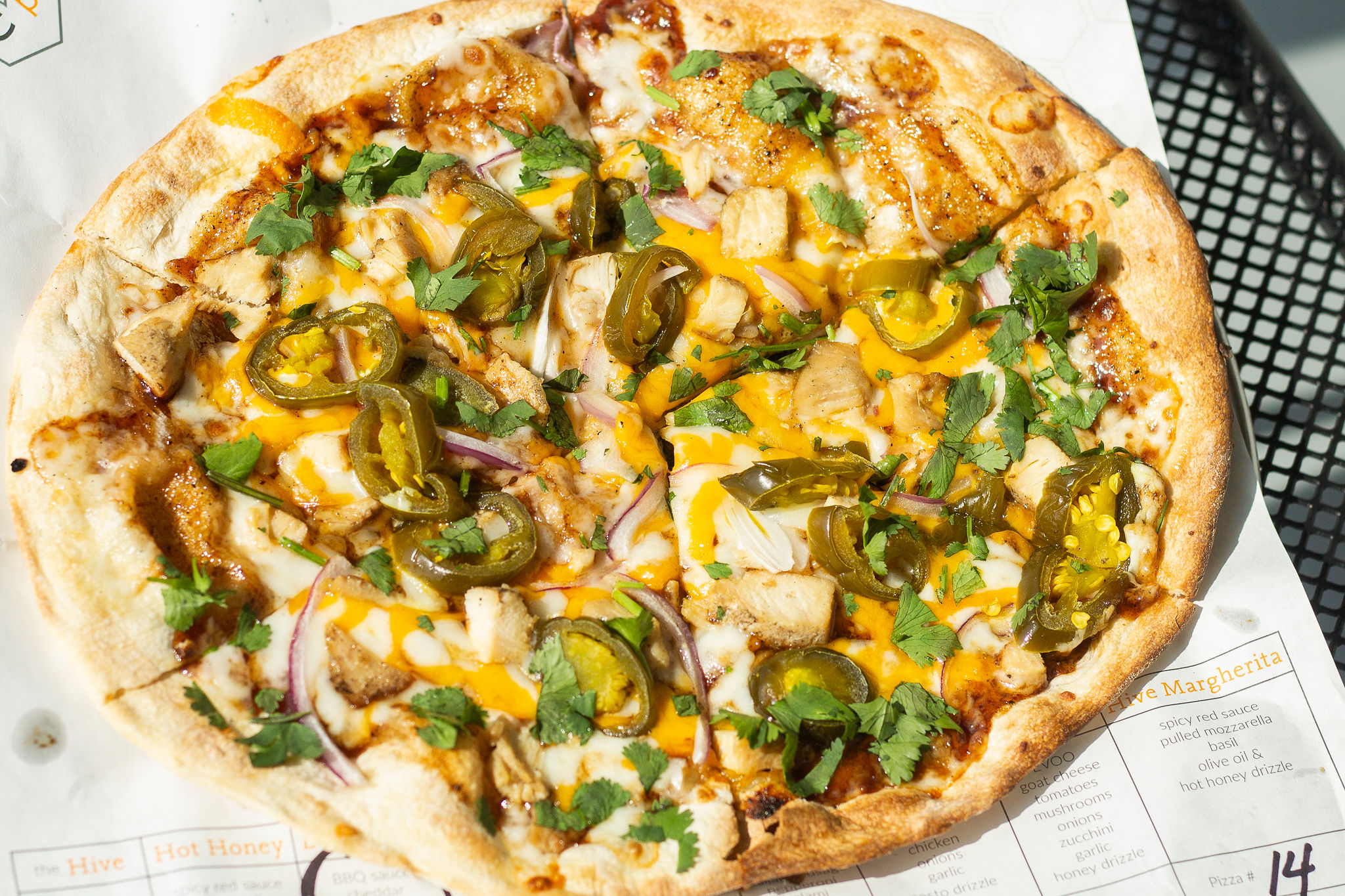 In a gas-fired oven, an infrared stone means crispier crusts and pizzas ready in under two and a half minutes, Mire says. Ordering and receiving your pizza faster allows you to spend more time with friends and family at Hive—or to safely and quickly complete your pickup. Scannable QR codes make for an easy, contactless experience.