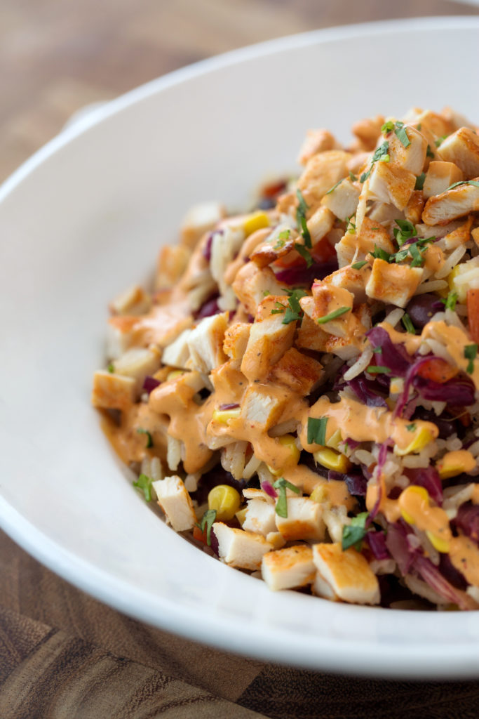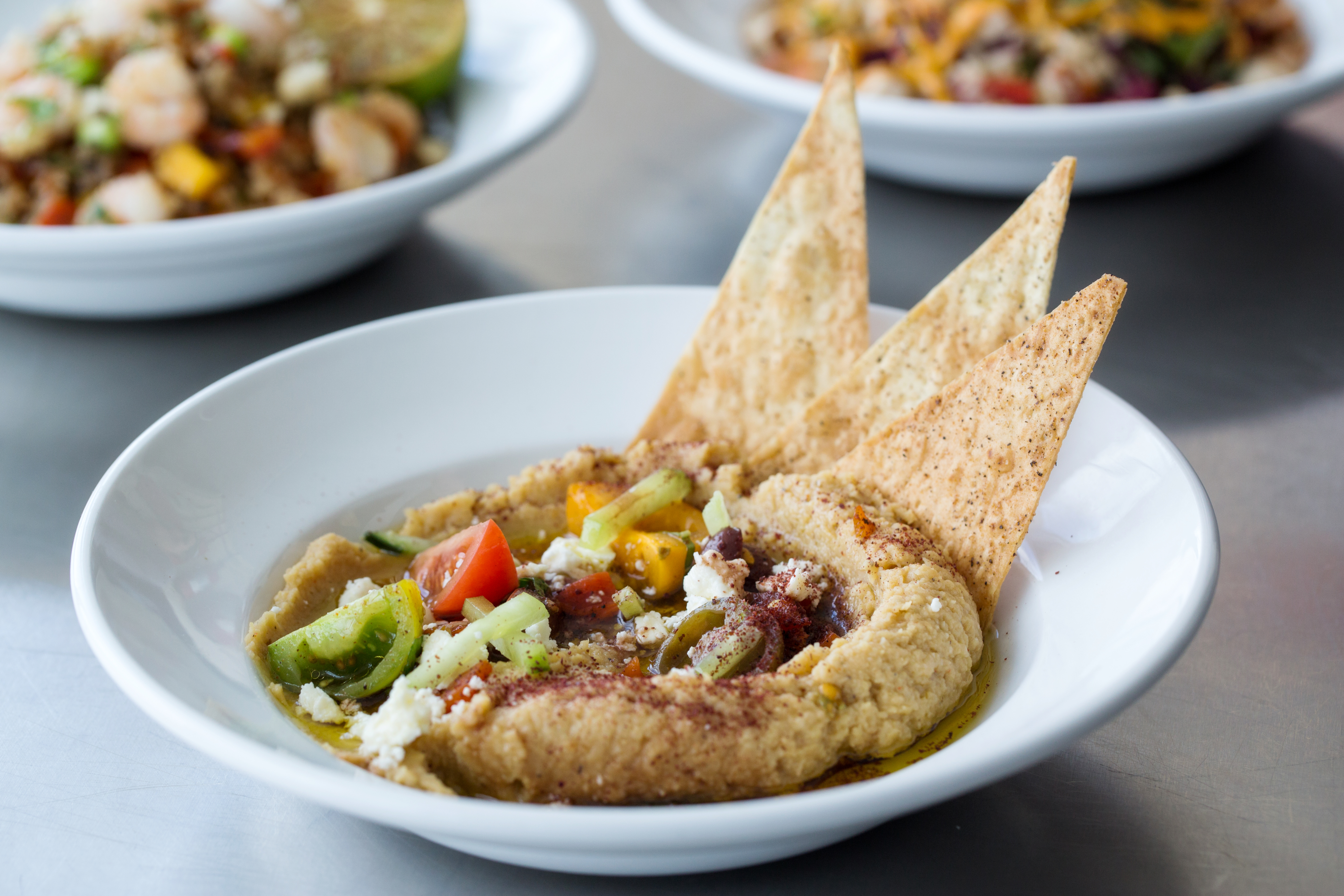 “You hear, ‘Get the bite right,’ a lot [here],” Smith says. “Be it the size or the cut on chicken or making sure our chickpeas are broken down to where they’re in quarters and not rolling off the fork, the cut size on any of the proteins, to where it extends the dish so that the first bite has the same ingredients as the last bite.”