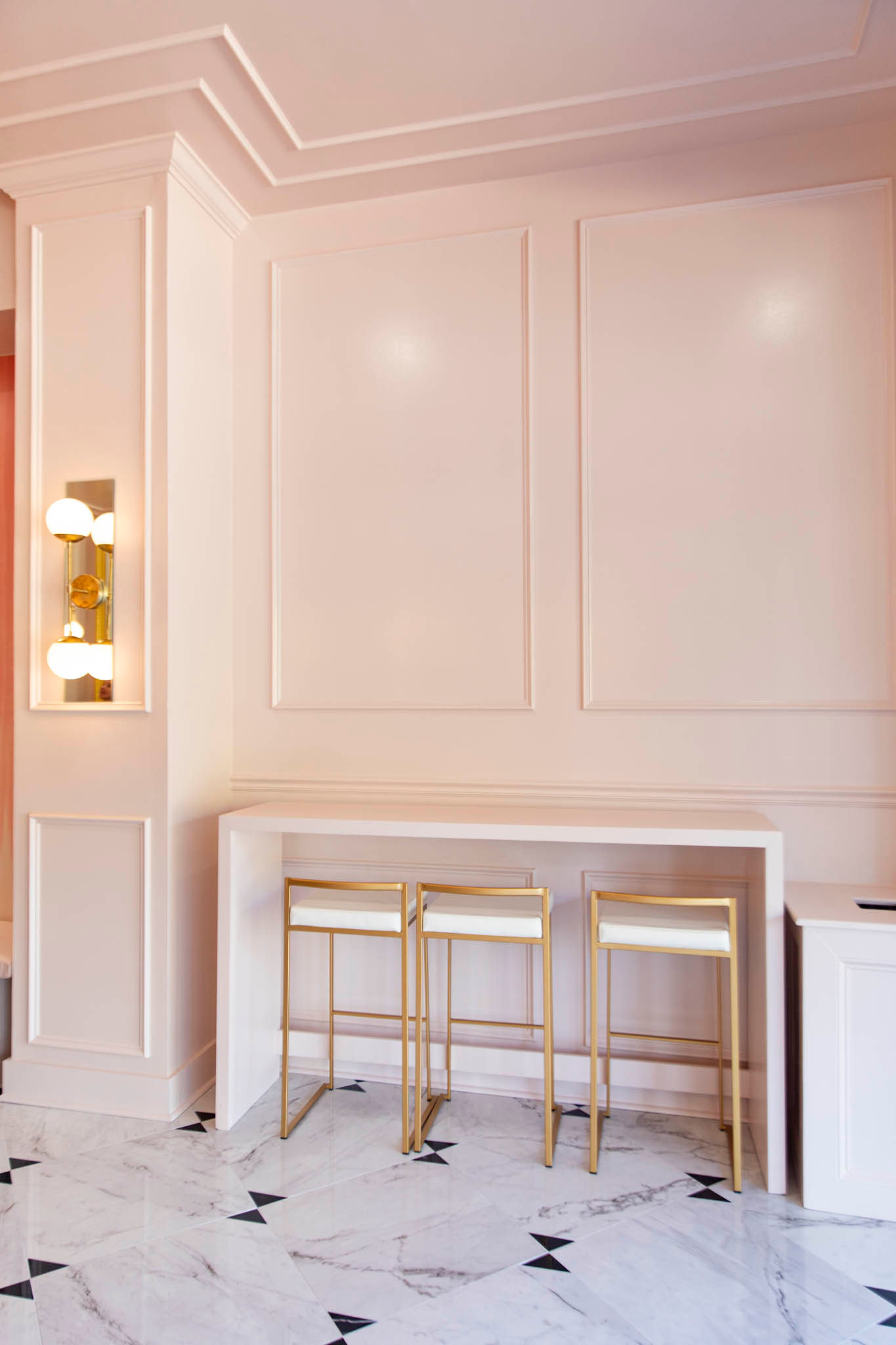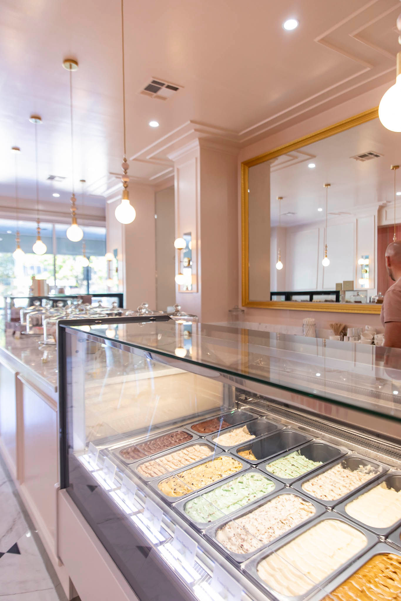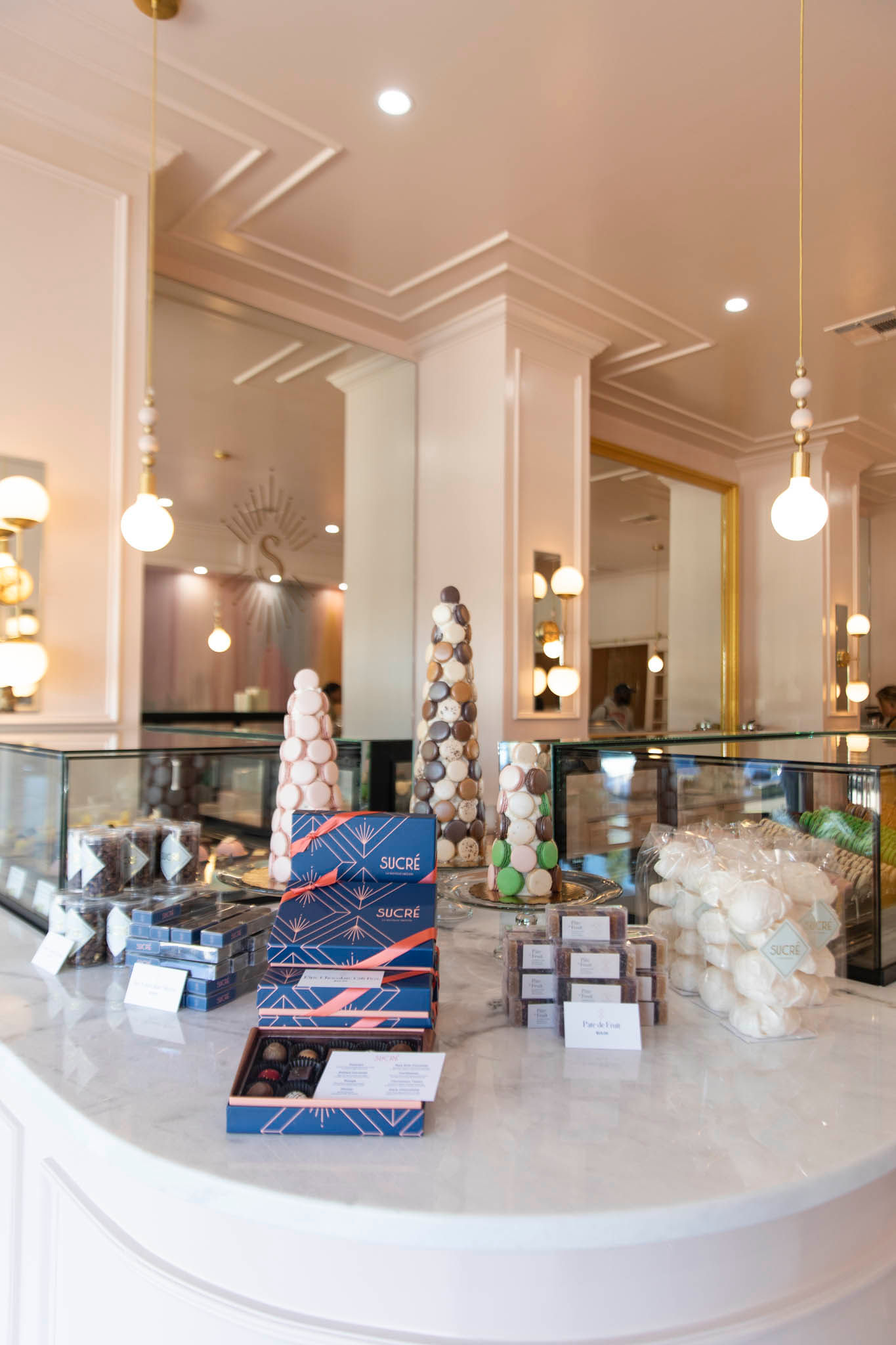 Harper designed the new shop, which was previously occupied by Planet Beach, in a Nancy Meyers-inspired style. Vitrano says they wanted the space to have a similar feel to Sucré’s Royal Street location in New Orleans, with an infusion of European and Parisian elements. Patrons will notice bow tie tile that was all hand cut, Vitrano says. The interior is adorned in pastels—from the light pink walls to the colors of the pastries themselves.