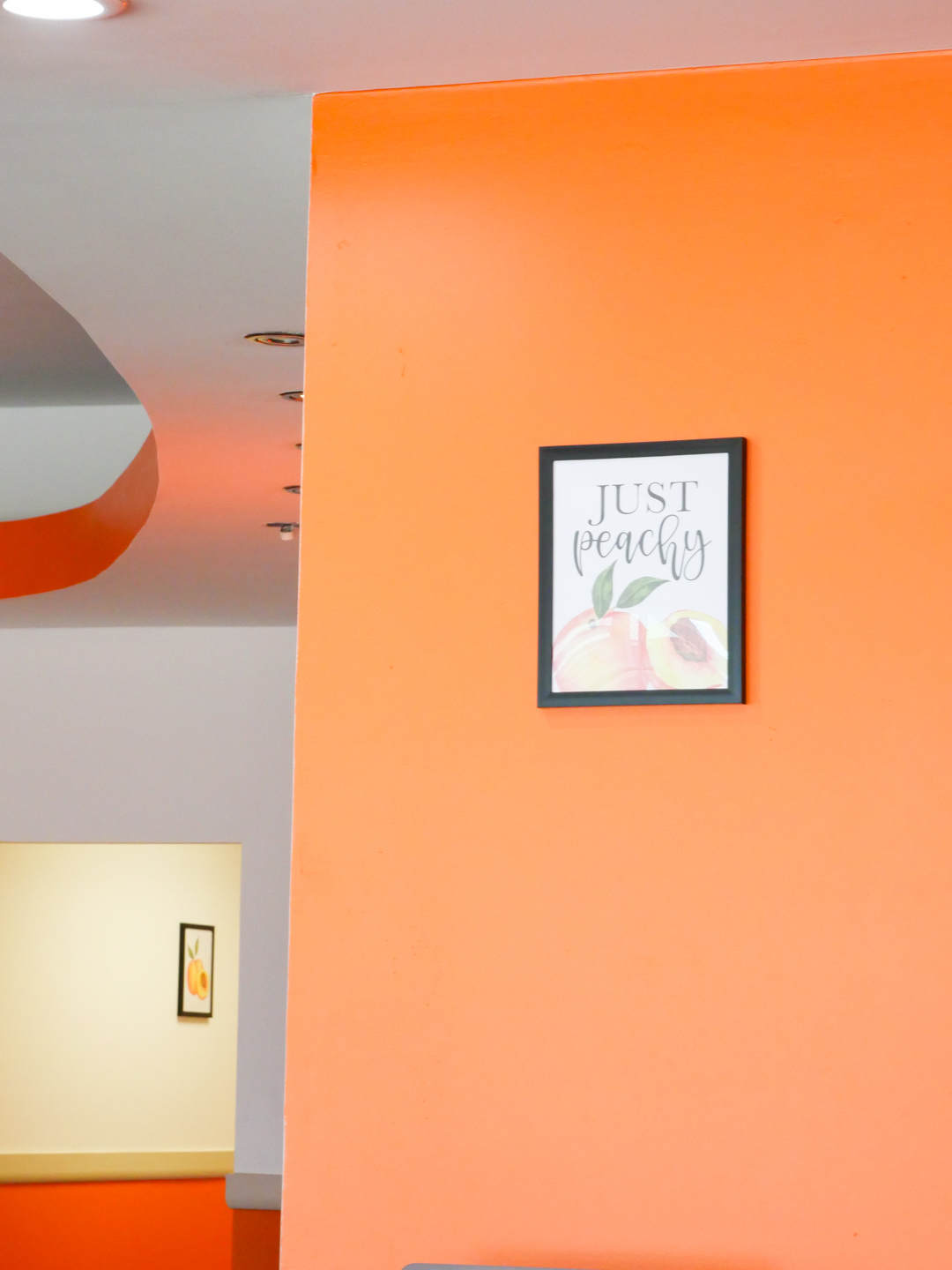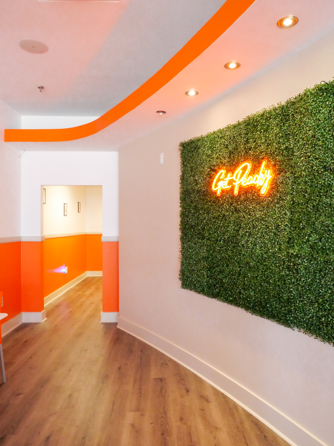 The interior has been transformed using the Peach Cobbler Factory’s branding, with orange and white paint and large “Baton Rouge” letters on the wall to match other locations nationwide. A greenery backdrop with a “Get Peachy” neon sign is ready for photo ops, along with other peach-themed details, like candles.