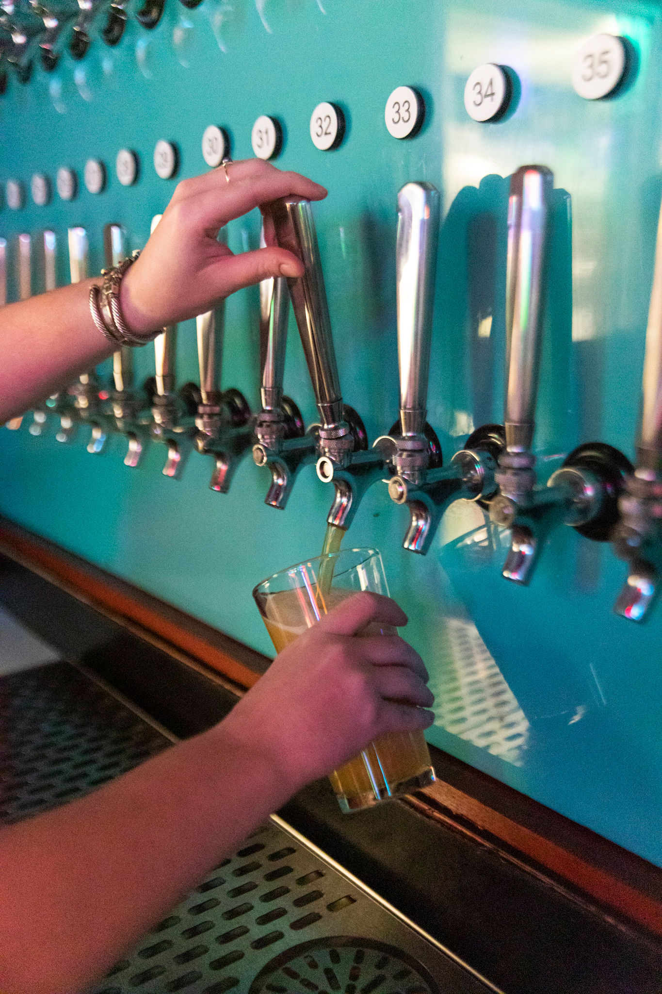 Vintage travel motifs are sprinkled throughout the space. Suitcases plastered with beer and liquor logos are displayed and vintage-inspired destination posters adorn the walls. There’s even a split-flap board that flips to show what songs are playing through the speakers and what specials are available. According to the founders, there’s more to come.