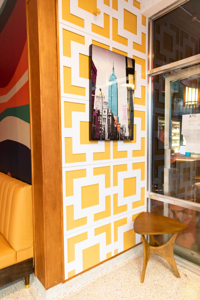 “It already had this mid-century modern feel with the color and the sloped roof,” he says. “One of our things to do was to take what it is and go with it.”