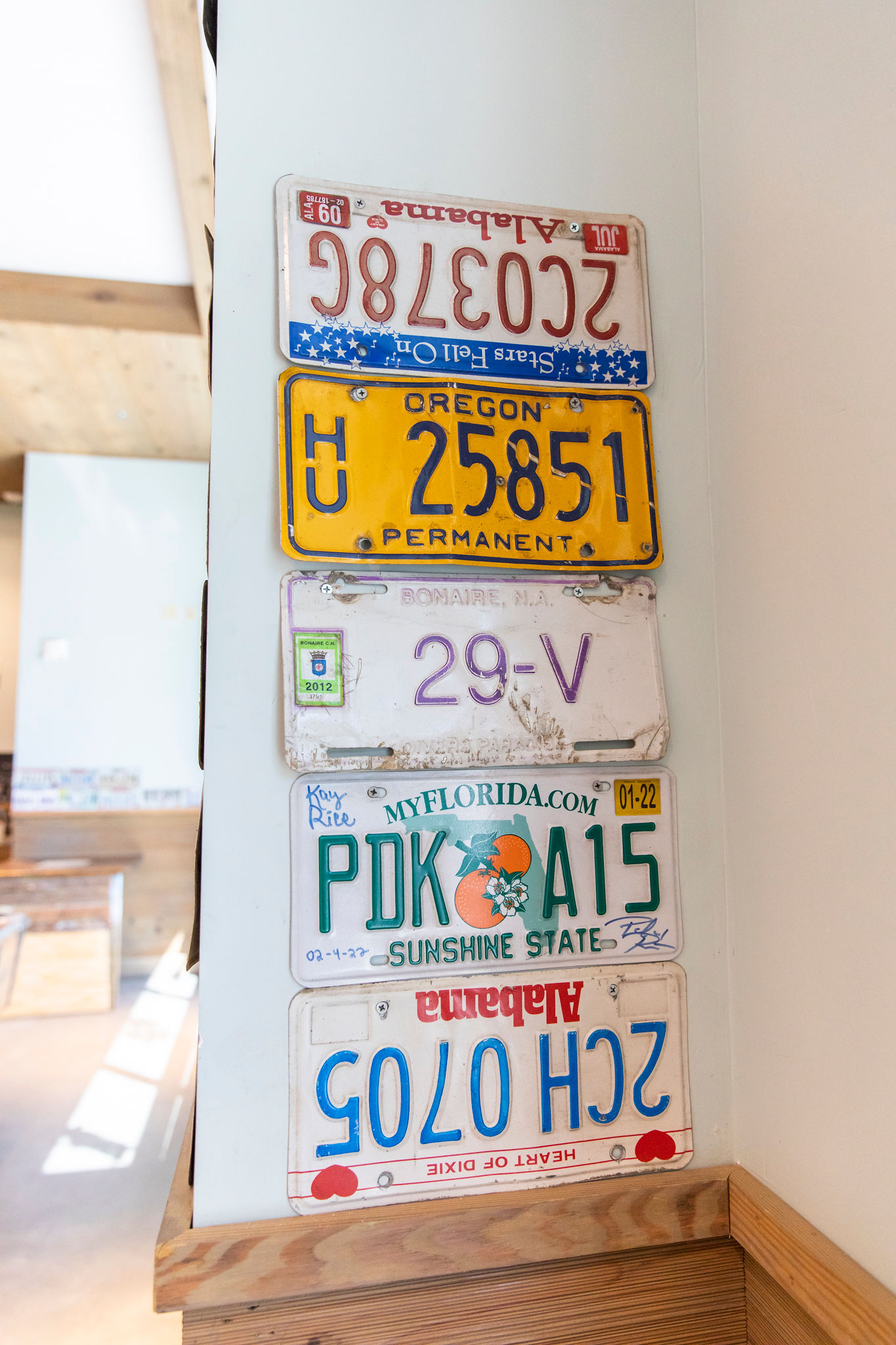 Right by the front door, there’s a small graveyard of rusted tires, wagons and wheelbarrows. Inside, there’s a bar made of worn tin and wooden fencing lining the walls. Everything is screwed in with miscellaneous beer bottle caps, adding to the character. There’s also a growing collection of license plates and old record sleeves from Orrison. When he brought in Alabama plates, the Baton Rouge staff made sure that each one was intentionally hung upside down, with some strategically placed by the restrooms.