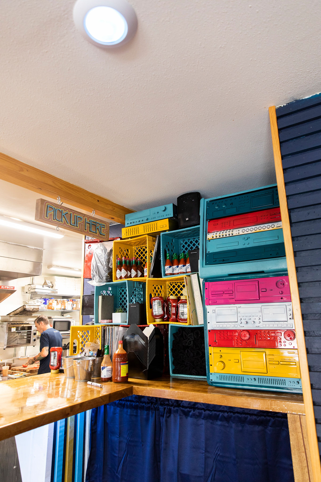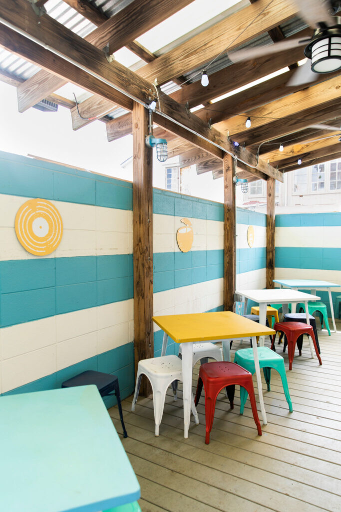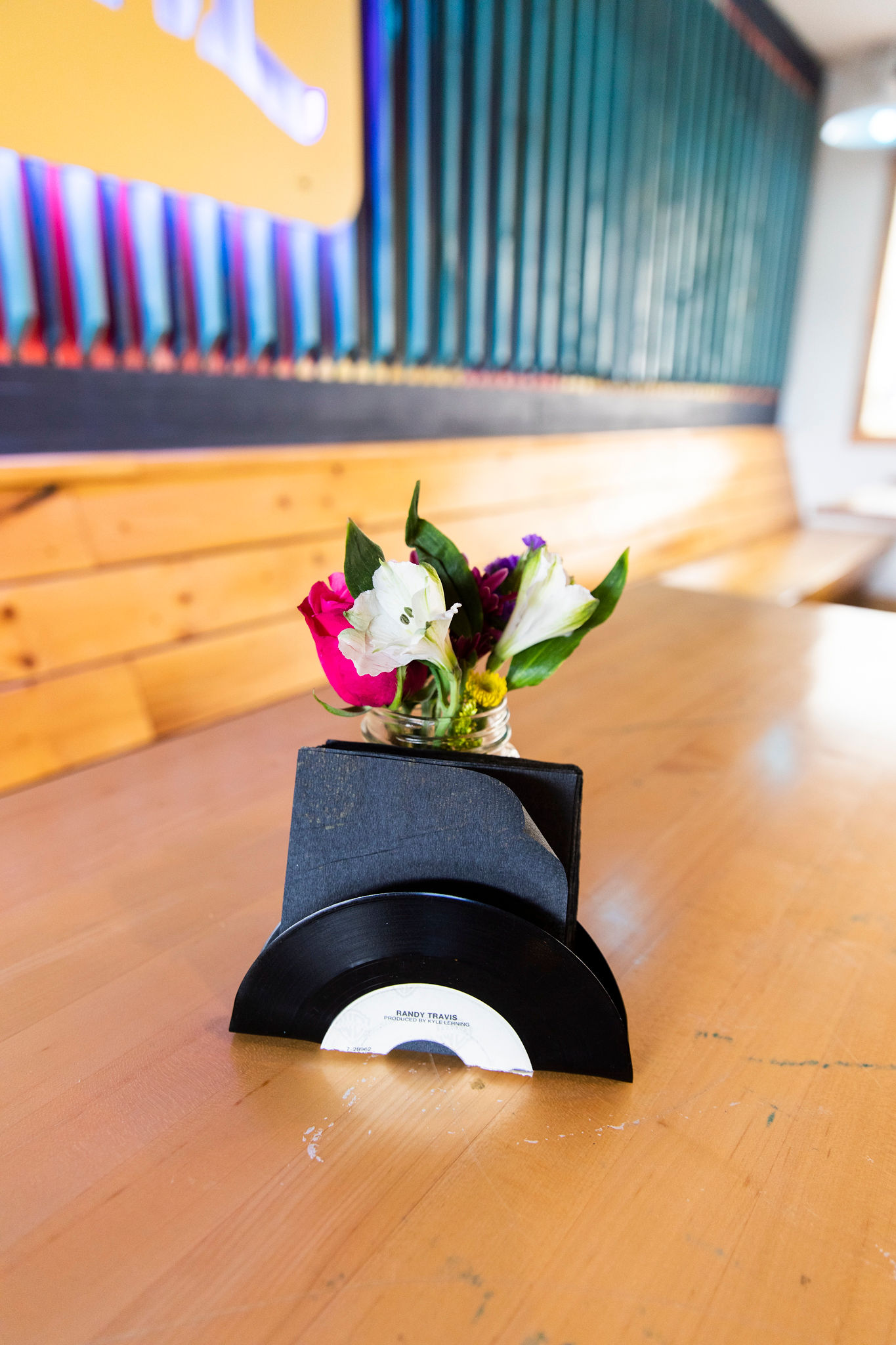 Inside, the sunshine-yellow and sky-blue color palette and wood accents feel rustic and cheerful. Murals, vinyl records and even a painted vintage stereo system nod to music, another important part of Wilson’s life.