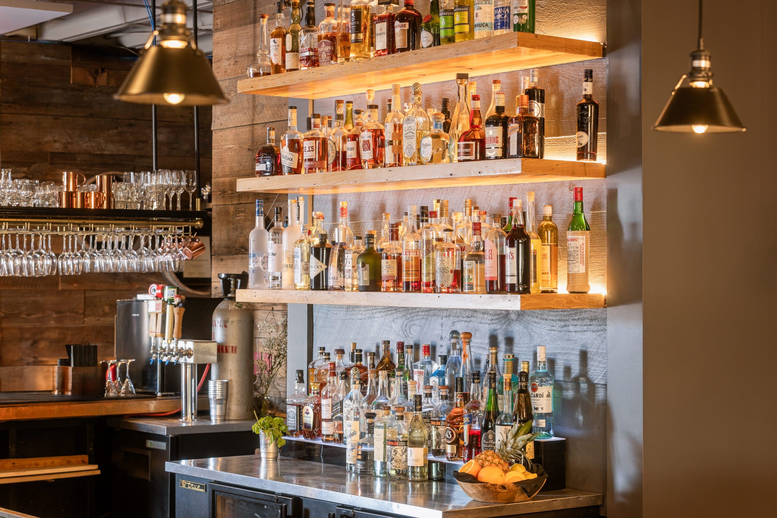 Designer Emily Torrance Berthelot with Salco Construction created the restaurant’s new look, which now feels brighter and airier. Dissected panels from wine crates give texture to a main wall on the west side, while contemporary light fixtures throughout add warmth.
