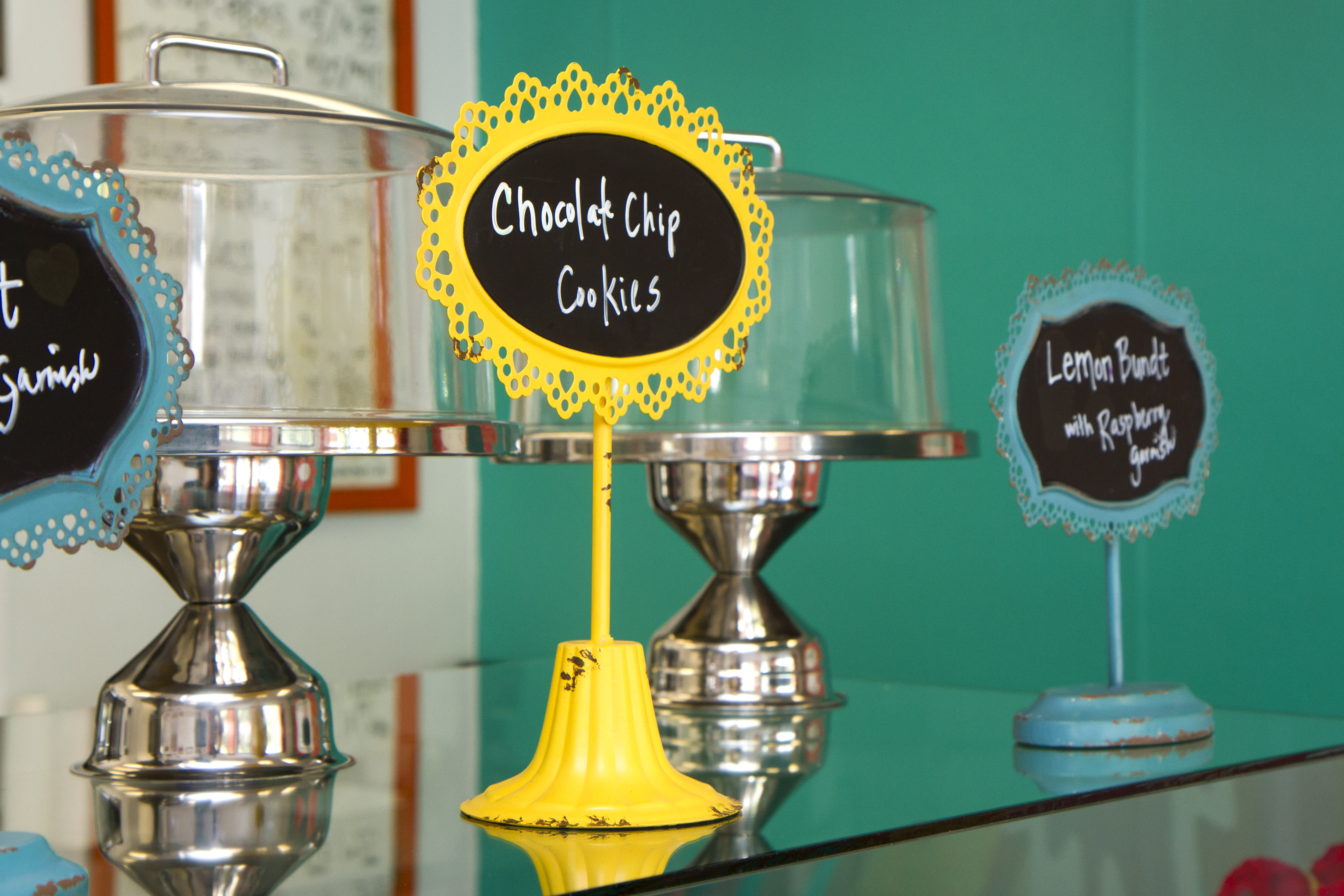 Selders’ favorite part is the distressed metal signs atop the glass case with chalkboard panels. Like the light fixtures above the register, the baked goods signs bring a style Selders wanted to include in her store.