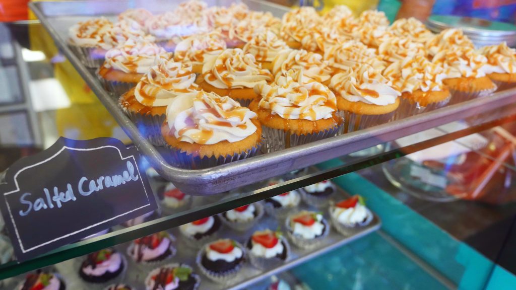 At the entrance, customers are greeted by a large glass case of baked treats ranging from classic cupcakes to bundt cakes. On the left of the entrance, a lounge area with retro-modern blue, brown and orange furniture allows cupcake lovers to eat, relax and make use of the store’s free wifi.
