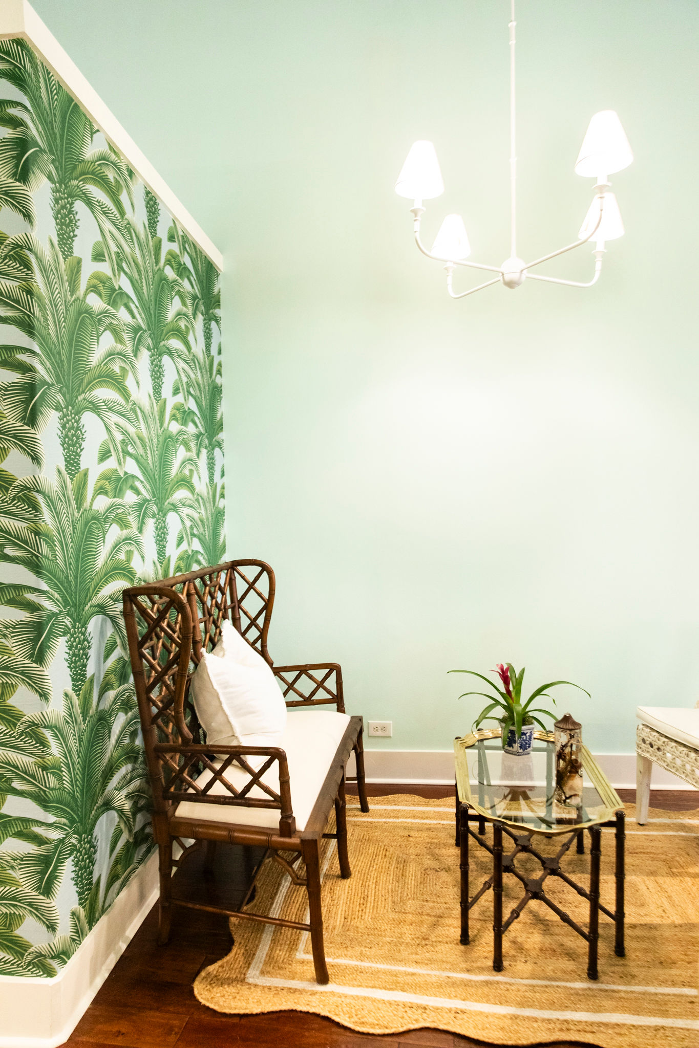 Other small touches include wallpaper with a print that reminds Howell of Eleuthera palm forests and midcentury modern furniture that is similar to the pieces she saw in her grandmother’s house growing up. Rattan fixtures and barstools add to the vintage island-y vibe. Howell plans to use the space as the home base for the successful mobile cocktail-making business she launched last year.