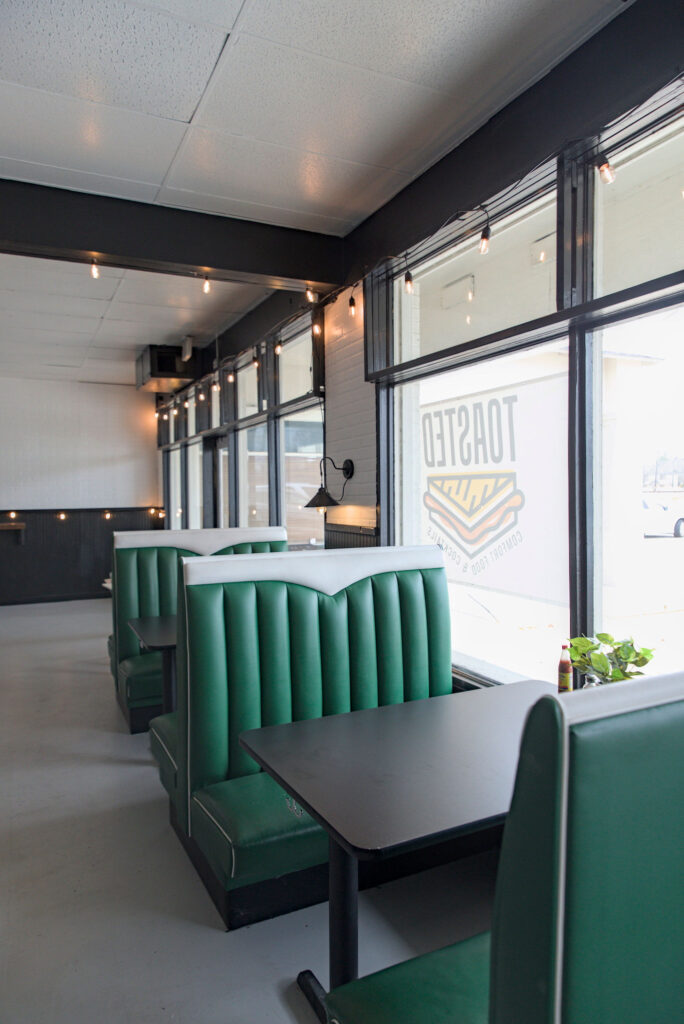 The 1,800-square-foot space is outfitted with plush and retro booth seats in a dark emerald green color along with a few high-top tables in the middle of the restaurant floor. The booths are complemented by more pops of green courtesy both fake and real greenery. A bar counter and kitchen is situated toward the back of the eatery.