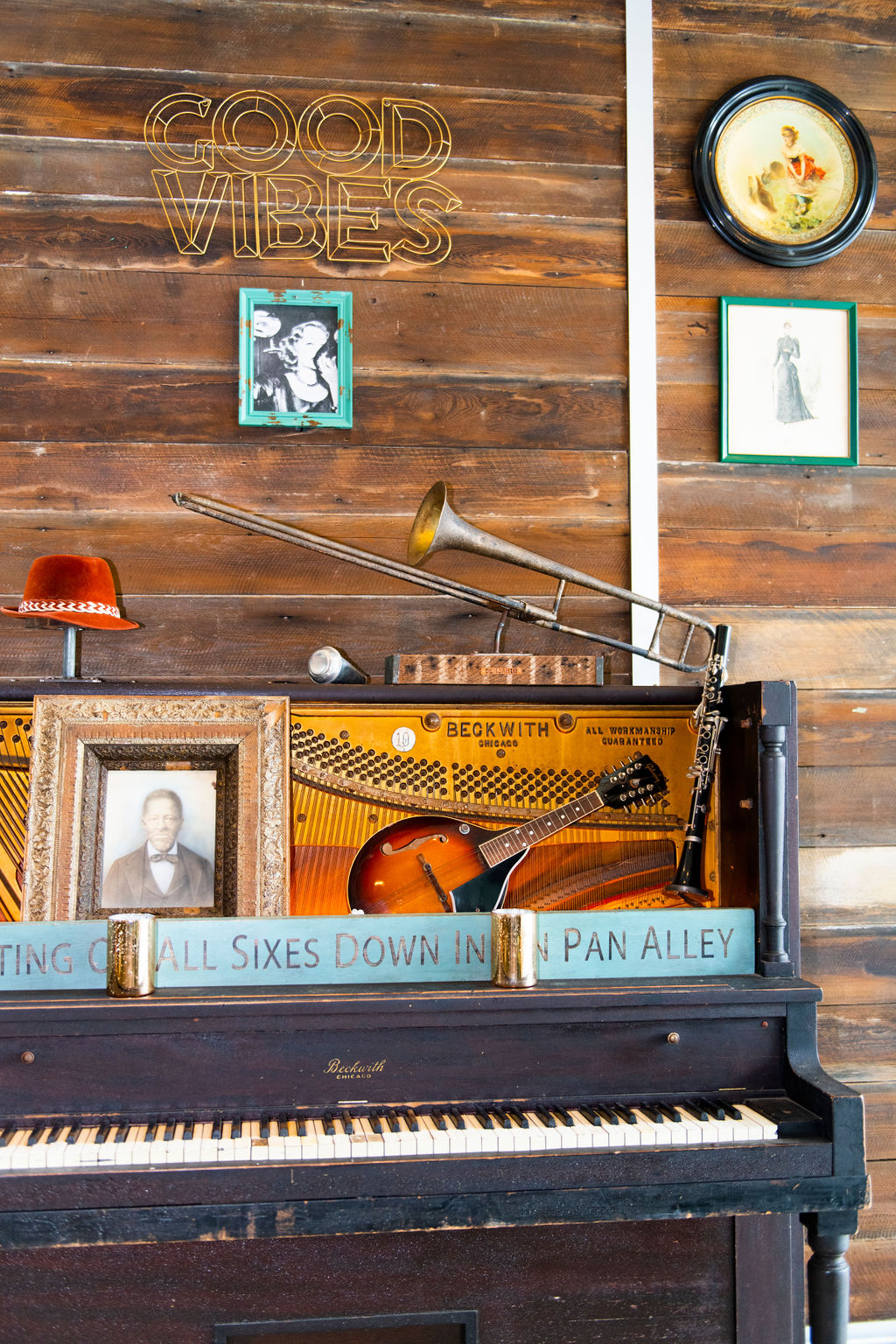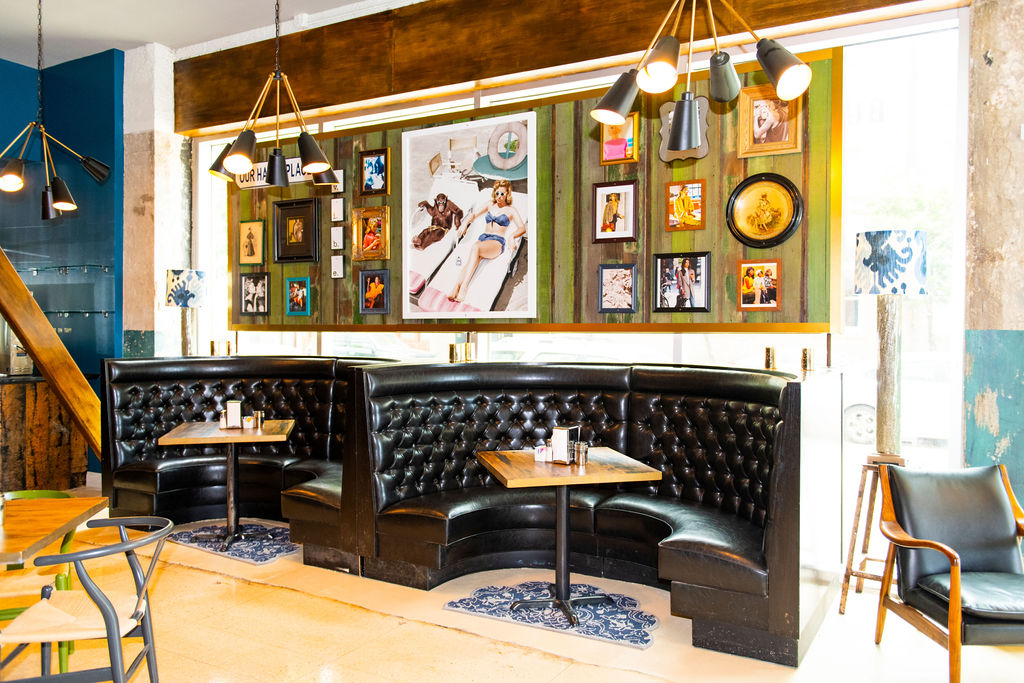 The restaurant’s interior is just as jazzy as the name implies. Along the wood-paneled walls, there are assorted photos of iconic women from different decades, including Marilyn Monroe, Farrah Fawcett and Gabrielle Union. A vintage piano, black leather booths and a sophisticated bar lined with blue, velvet-padded squares give The Vintage a classic vibe.