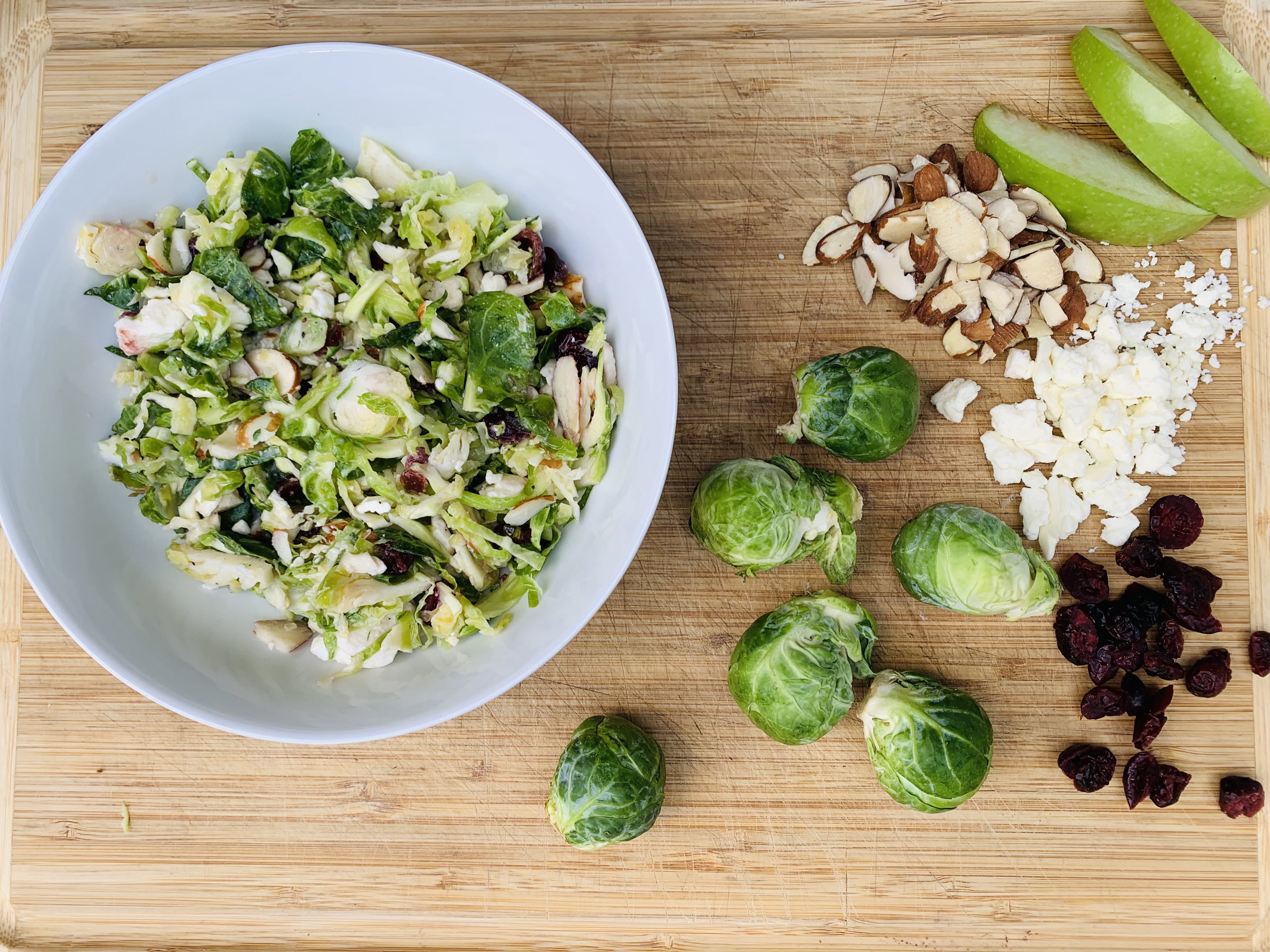 This recipe, which is more guideline than rigid rule, is fast and easy. It’s ready in minutes and it only requires a few hours post-assembly to allow the flavors to meld. All you’re doing is slicing Brussels sprouts very thin, adding a few additional ingredients and tossing everything in a quick homemade vinaigrette. Beyond Thanksgiving, this is a great salad to keep around the fridge for a quick lunch or a dinner side. Add chopped chicken or chickpeas for some protein.