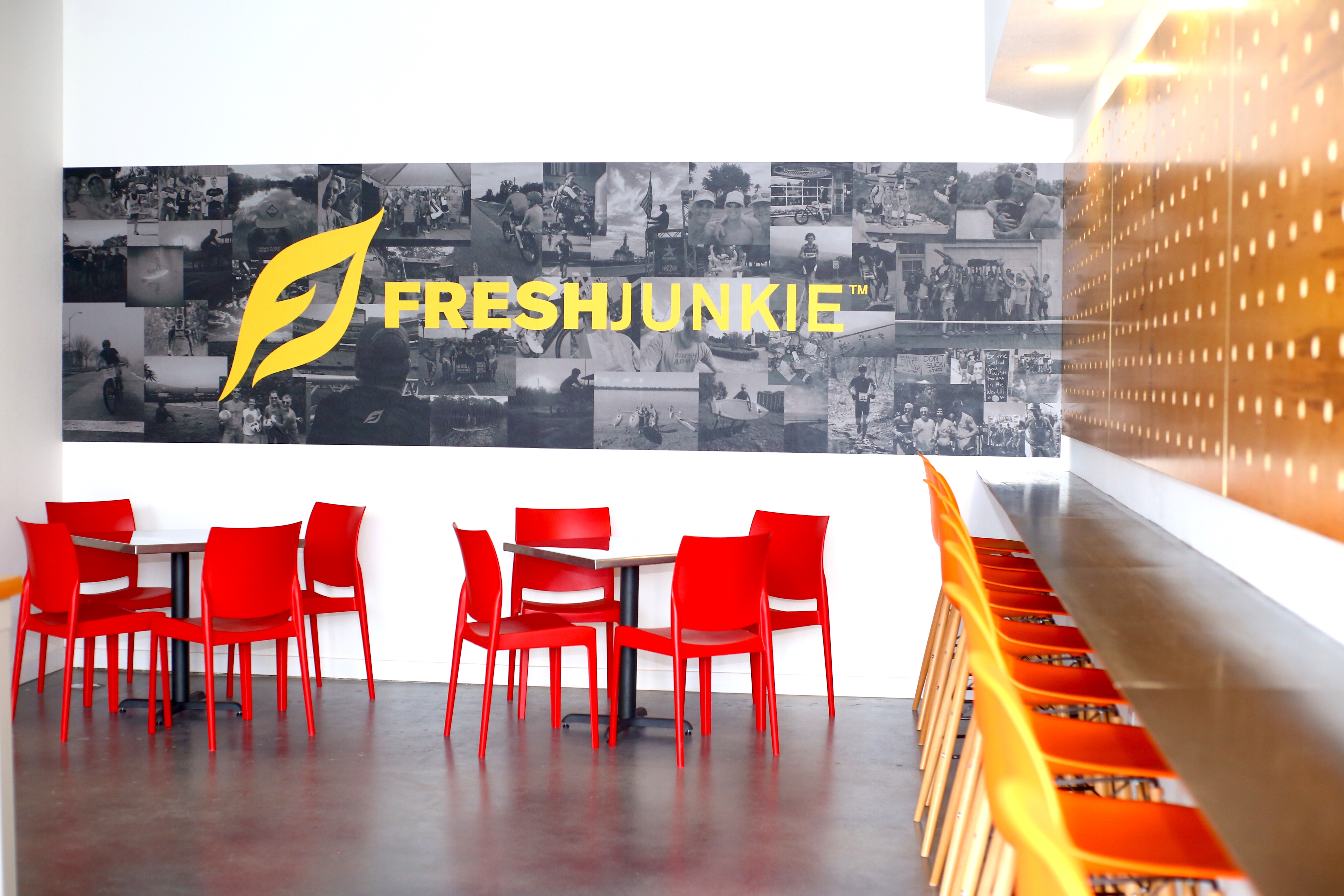 Converting the former Smoothie King space into this new FreshJunkie location has been a lengthy process. Fellows and his team worked over seven months to remodel the restaurant and create an original look. With accents like a raw steel countertop, concrete flooring, a pegboard wall, an original FreshJunkie mural and modern seating that fits about 20 patrons, the spot is entirely unrecognizable for anyone who frequented the area before.