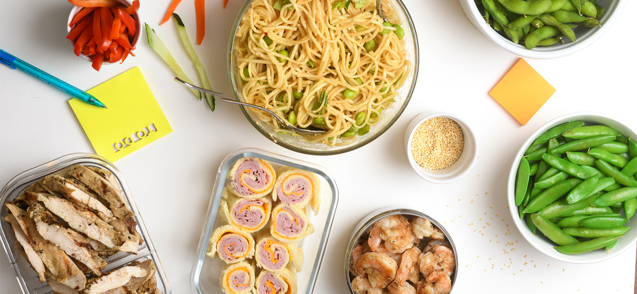 Making portioned lunches on the go takes a little bit of planning, so I make my prep work as simple as possible. Cooking extra proteins like chicken breasts and shrimp and storing them in individual portions makes it easier to assemble lunches on the go. I like to have fresh vegetables on hand to add a little color and crunch to my meals. I’ll also cook a couple of different starches or grains, like whole-wheat pasta or quinoa, and stock a variety of dressings or condiments to give me options to change up the flavor profile.