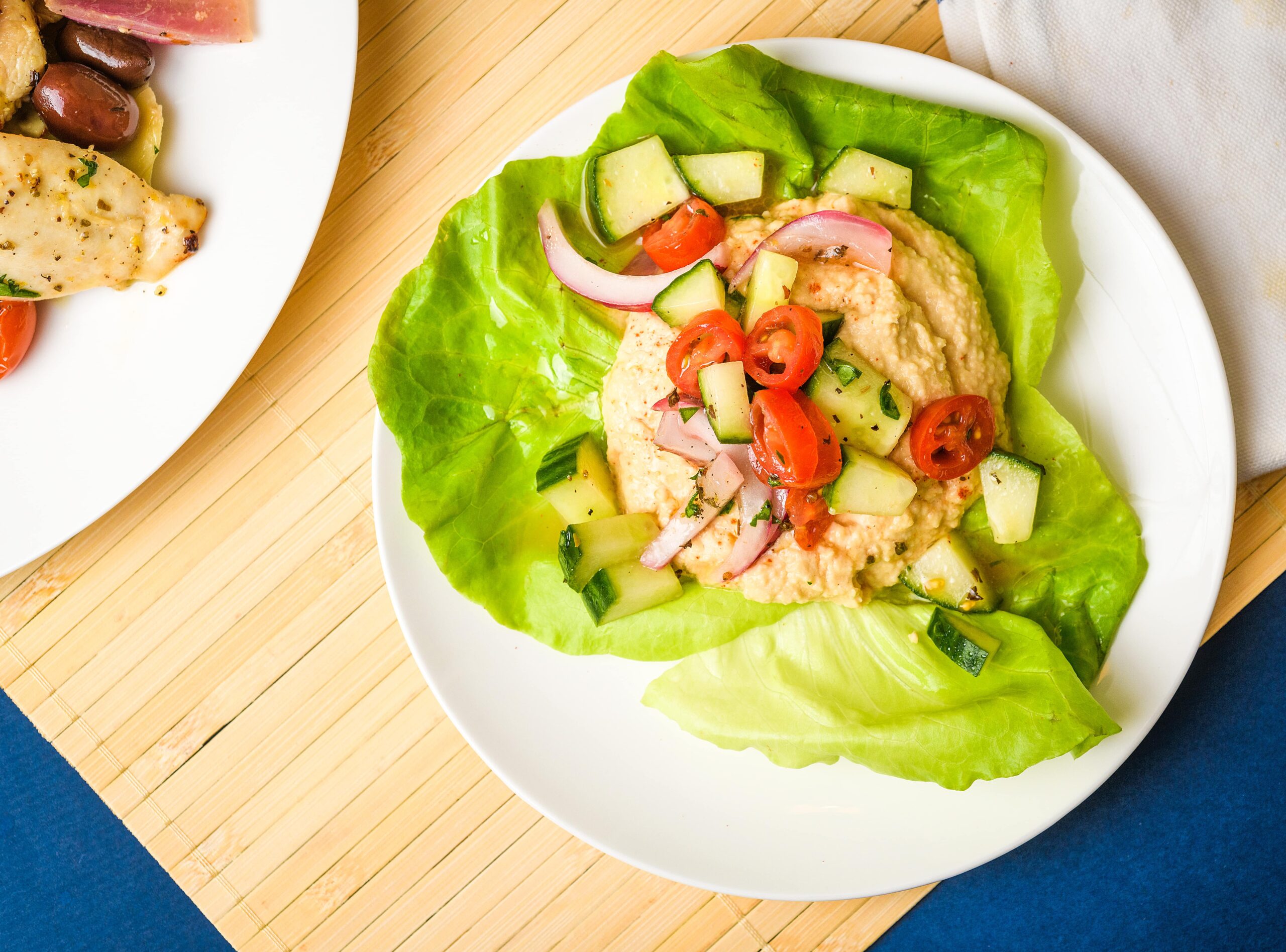 3. Place the lettuce leaves onto 6 salad plates. Put 2 big spoonfuls of the hummus into each lettuce leaf. Top each one with a couple of spoonfuls of the vegetables. Serve.