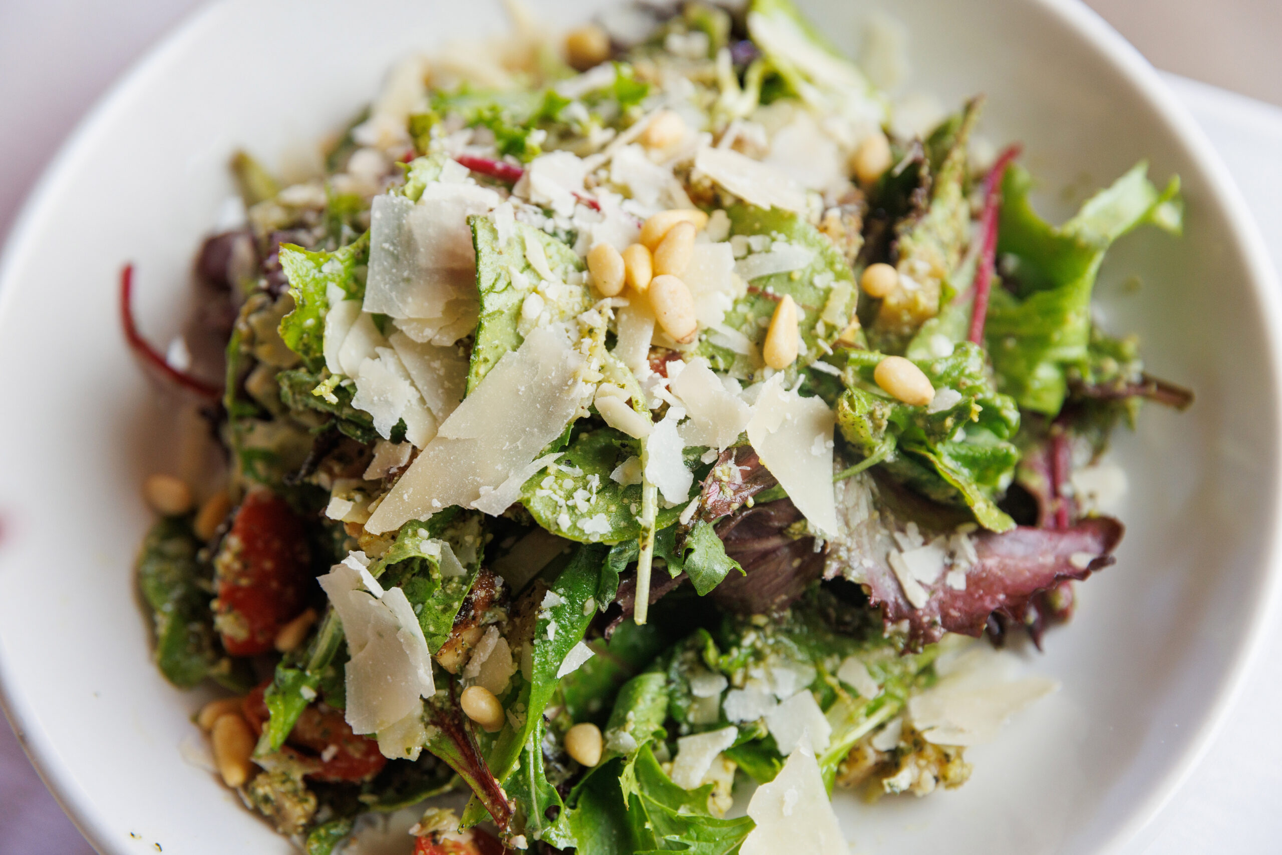 Our final starter, the Pesto Salad, however, struck the right balance, with mixed greens, grape tomatoes, pine nuts and shaved Parmesan in a pesto dressing. The dressing was pungent, salty and just right, bringing all the ingredients together for a nice palate cleanser before our main course.
