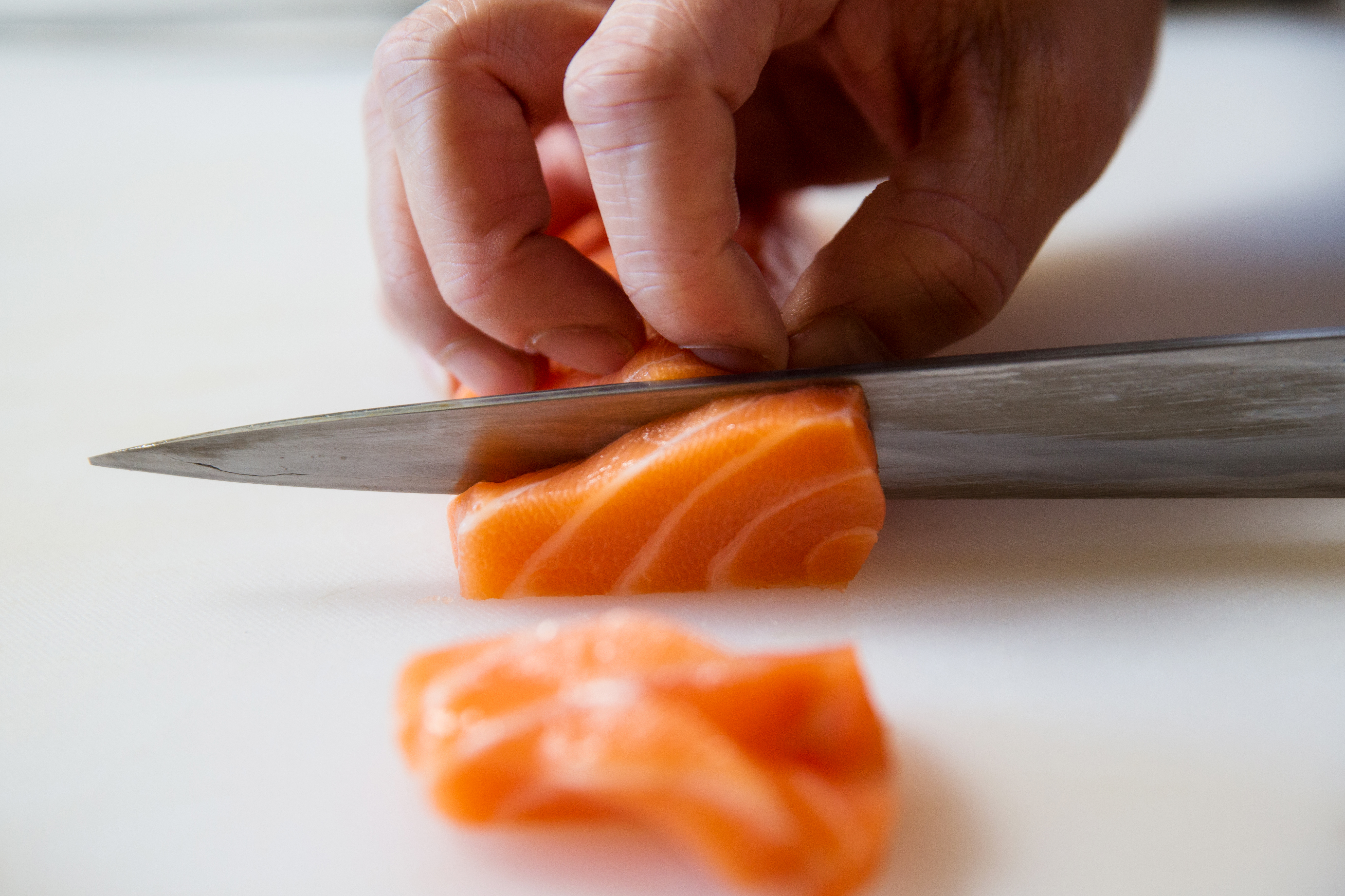 • Slicing: Using knives on hard surfaces can dull the blades. Cong likes slicing sushi and raw fish on polyvinyl acetate, a softer board surface. Wood cutting boards work, too. When slicing protein or veggies, try to make your cut with one smooth, clean movement. Slicing the same spot more than once will bruise or change your ingredients’ texture.