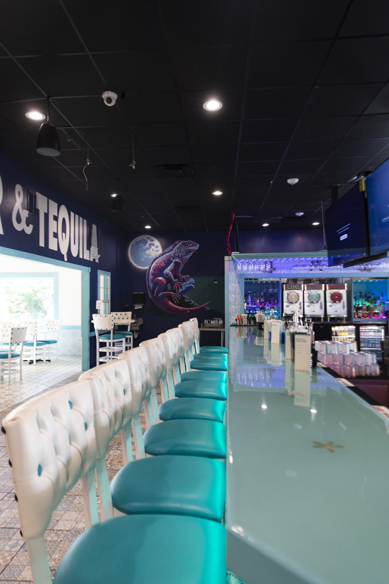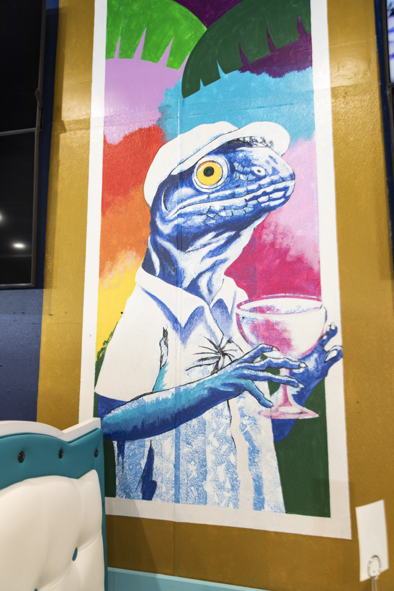 A focal point of the new Blue Iguana experience is certainly the visuals. Bold artwork on the walls depicts an iguana as Elvis Presley, an iguana perched on the moon and an incomplete iguana astronaut. Oseguera says artist Ricardo Barreiro Guzmán was essentially given creative freedom with the pieces. The team also updated the Blue Iguana logo to feature an iguana formed of small doodles.