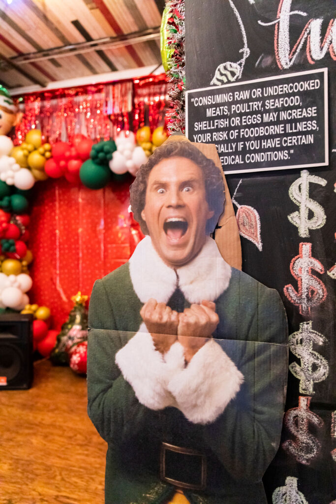 The team turned the stage side of the bar into an “ugly Christmas sweater,” decorated like one big present. Buddy the Elf stands tall next to the bar’s stage. But he’s not just there to find out your favorite color. Dine-in customers are encouraged to take a photo with him (or elsewhere in the bar), post and tag Jolie Pearl for an entry into an Igloo cooler raffle contest. The winner will be revealed on Dec. 22.