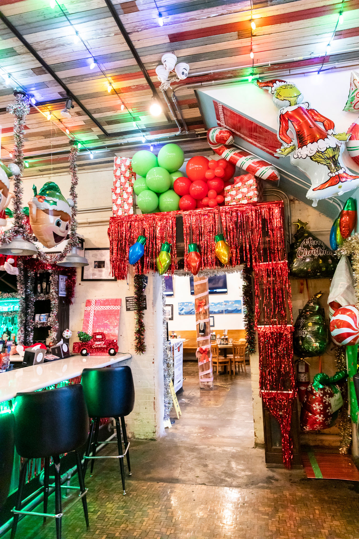 The staff, usually clad in the restaurant’s signature blue shirts, now dresses in red uniforms and Santa hats. For the second year in a row, more than 800 merry balloons line the ceiling, floating underneath rows of colorful string lights. Tinsel and wrapping paper cover the walls to go along with the never-ending Christmas playlist.