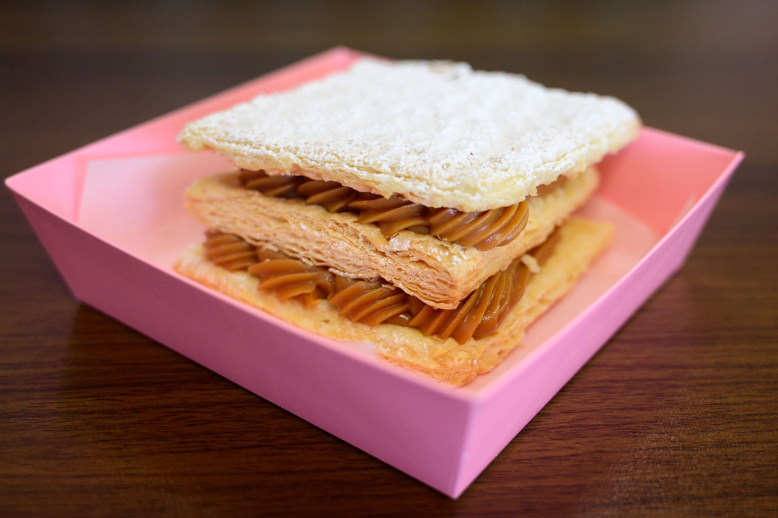 Inside the cold case at the front counter, patrons can find an expansive selection of drool-worthy desserts. The most sought-after items include Nutella and Biscoff cheesecake slices. Another standout is the Venezuelan tres leches, which Martinez says is a little sweeter and richer than the Honduran-style version that’s popular at El Bodegón Latin Market. Other menu highlights include coffee drinks; rice puddings; conchas; strawberries and cream; smoothies; flans; turnovers; and napoleons, a flaky layered pastry dessert. For those who crave something savory, there are also Colombian- and Venezuelan-style breads stuffed with cheese, beef, chicken or ham.