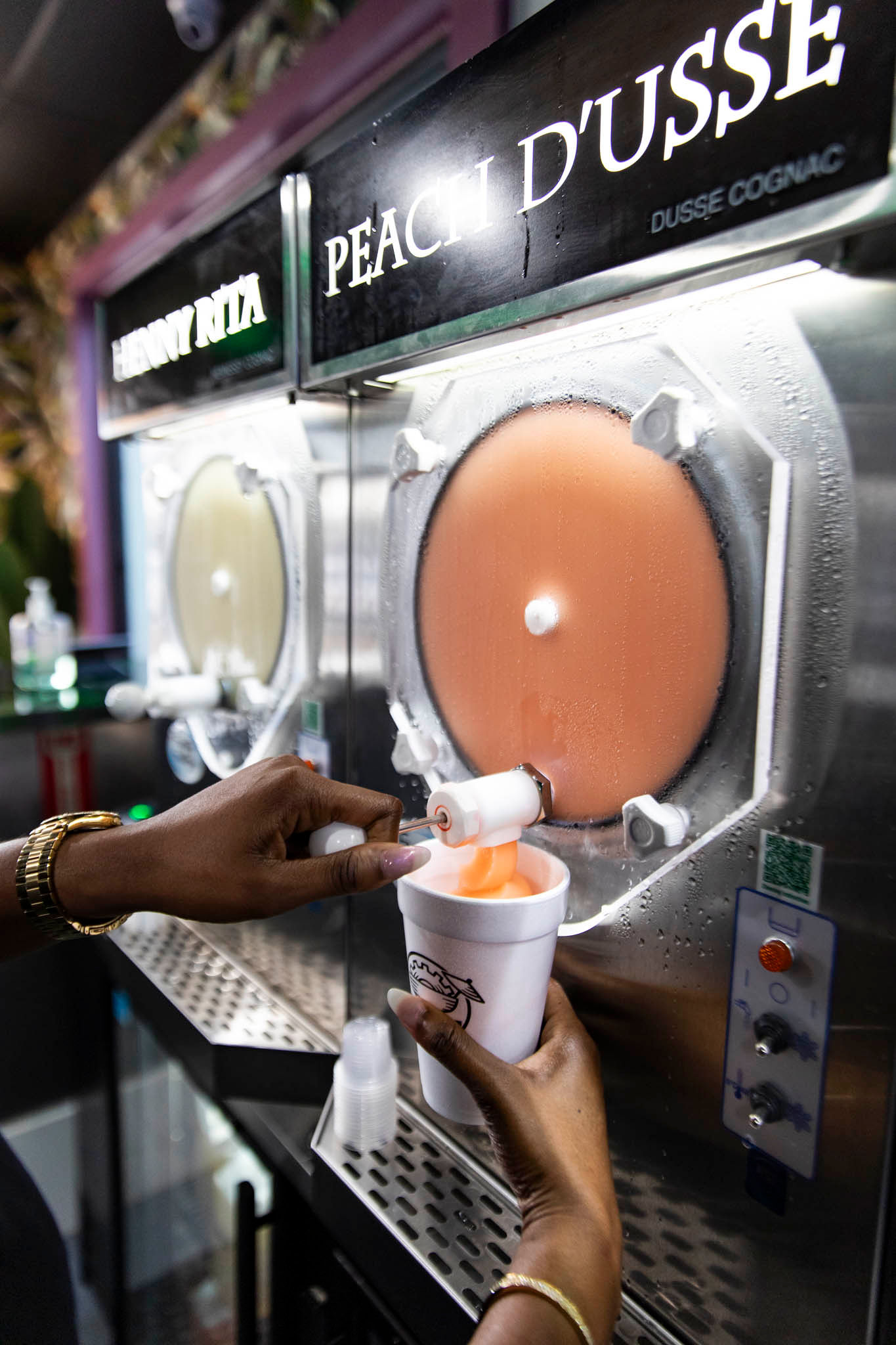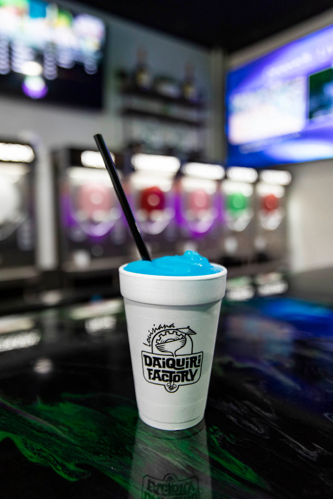 Daiquiri flavors like the Strawberry Hennessy and Peach Dussé have quickly become customer favorites. The menu also includes flavors like Blue Raspberry, Frosé, Jungle Juice and Piña Colada, served in 16-ounce, 32-ounce, half-gallon and gallon sizes. Guests can customize their cocktails by mixing flavors and selecting spirits like rum or cognac. Beer and shots are also served.