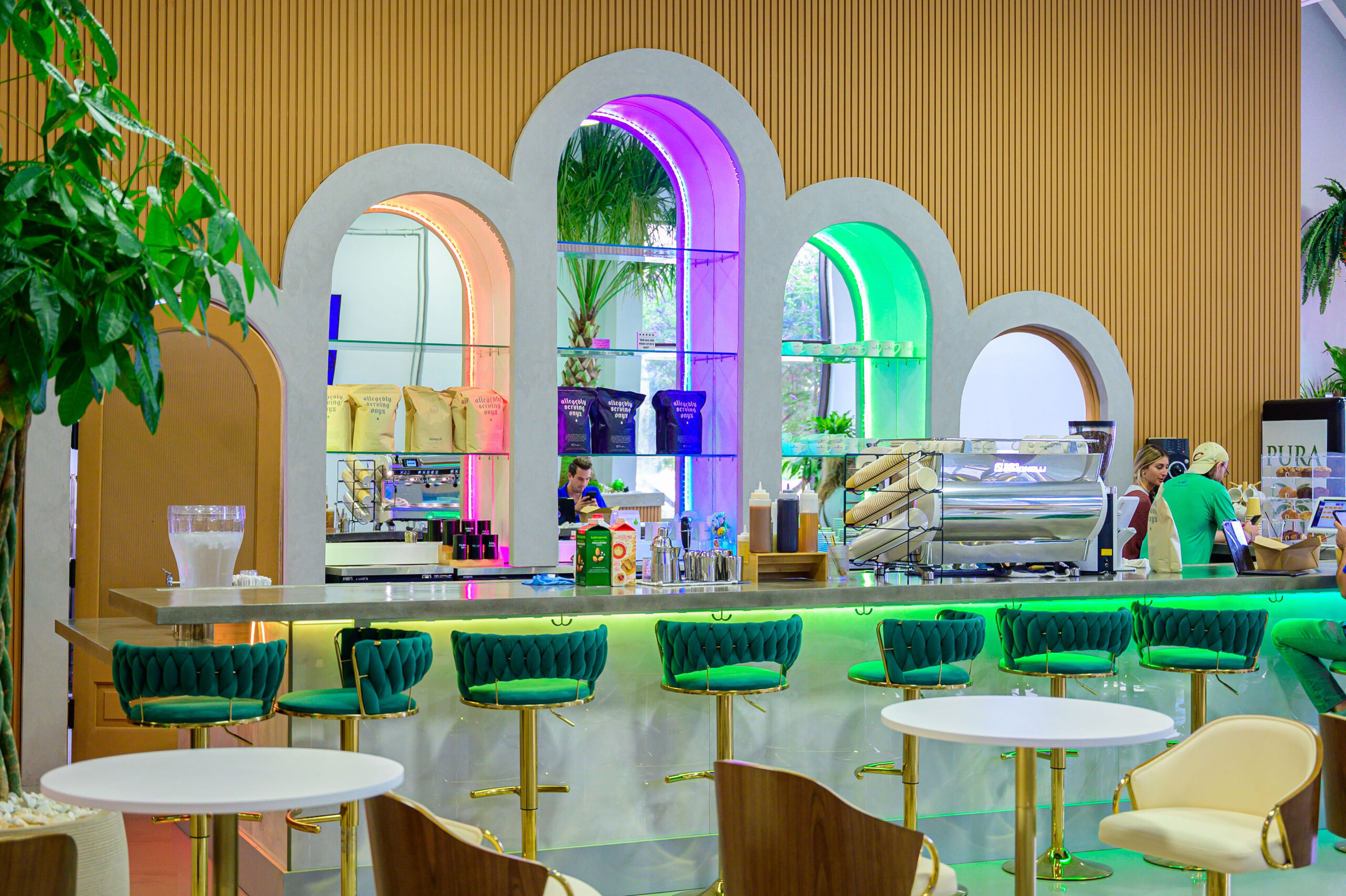 The goal was to create a vibey space that was big enough for patrons to spread out while also providing a relaxing vibe for work and study. Green velvet stools and couches, gold details and natural wood accents along with the shop’s name were inspired by Jordan’s home in Costa Rica. There are live plants and colorful neon lights throughout.