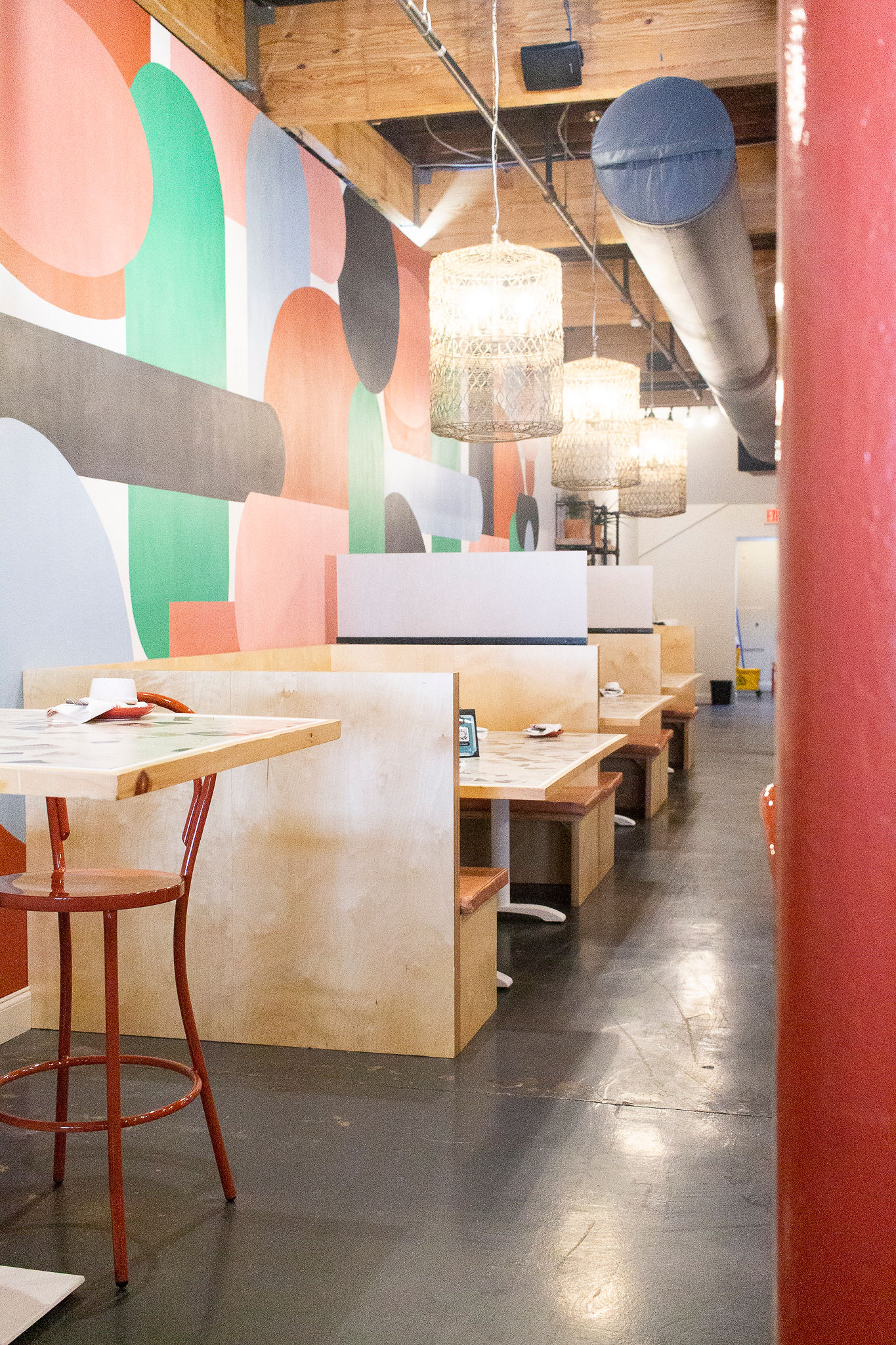 Inside, the focal point is an abstract mural with colorful shapes, designed by Bridget Tiek of Tiek and Co. and brought to life by local artist Marc Fresh.