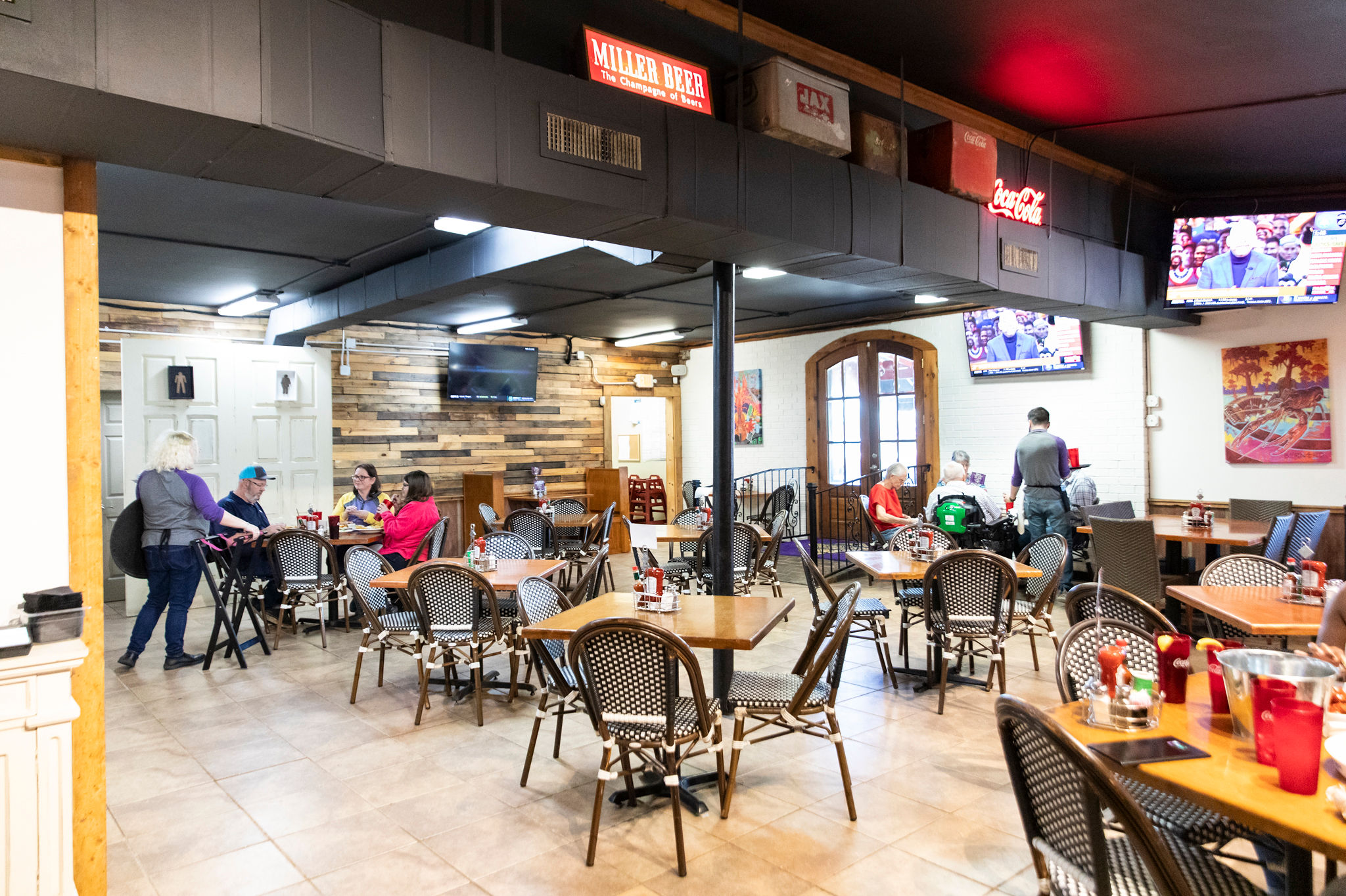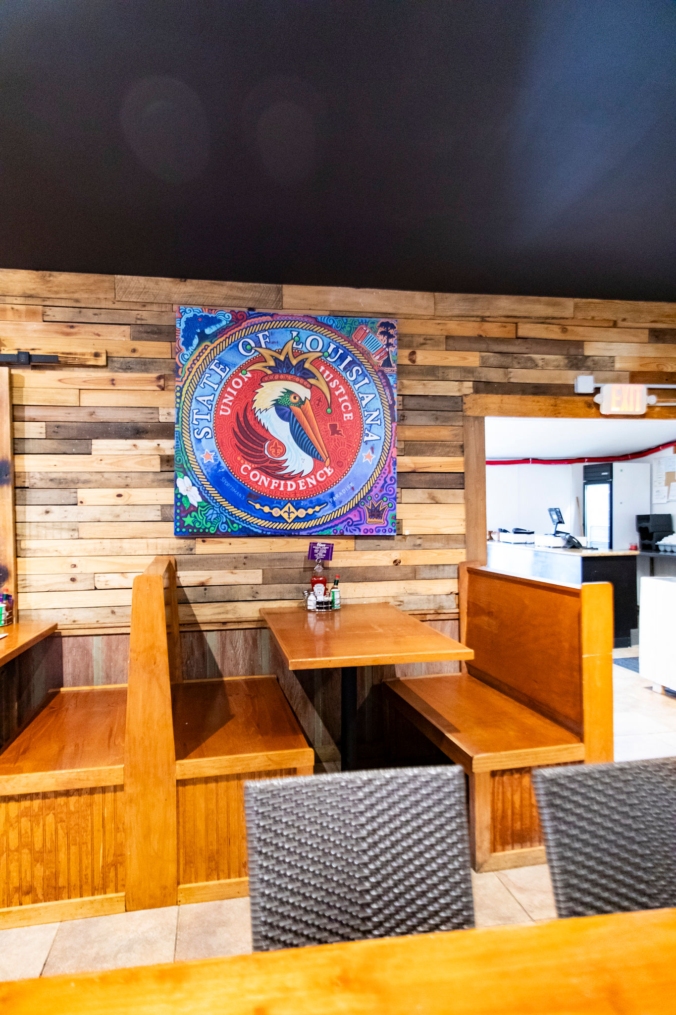 Inside, diners can enjoy a drink at the neon-lit bar, or pick up to-go dishes like fried cheese and crawfish etouffee from a sectioned-off area.