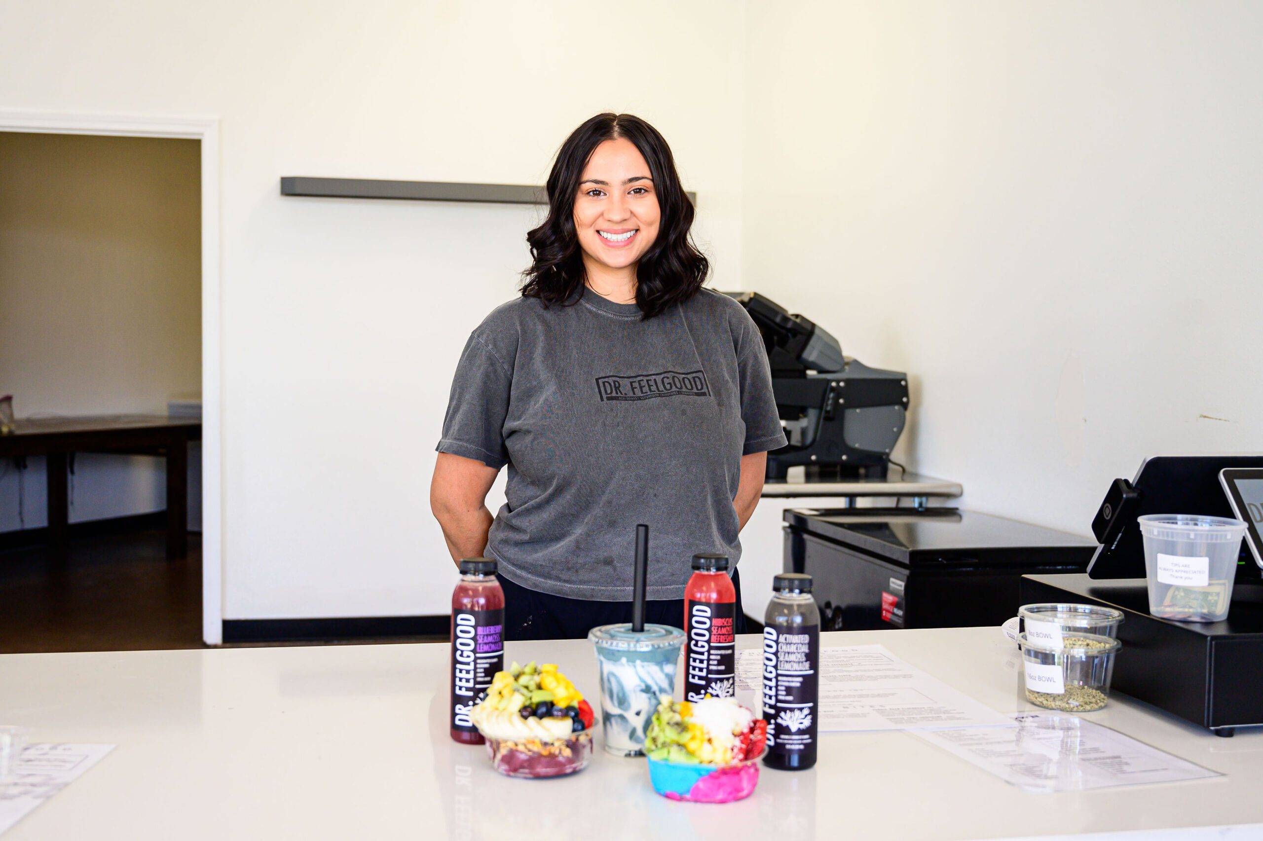 Smith’s favorite order at the moment is the shrimp boil salad, a fresh salad of organic greens, corn, cucumber, tomato, buttermilk ranch and, of course, shrimp. She also is a huge fan of the shop’s acai bowls, offered build-your-own style with an unlimited number of fruits and toppings. For bases, customers can choose between acai, mango, coconut cream, blue cream and dragon fruit. Dr. FeelGood’s bowls and select treats also use locally sourced honey from Janway’s Raw Honey.