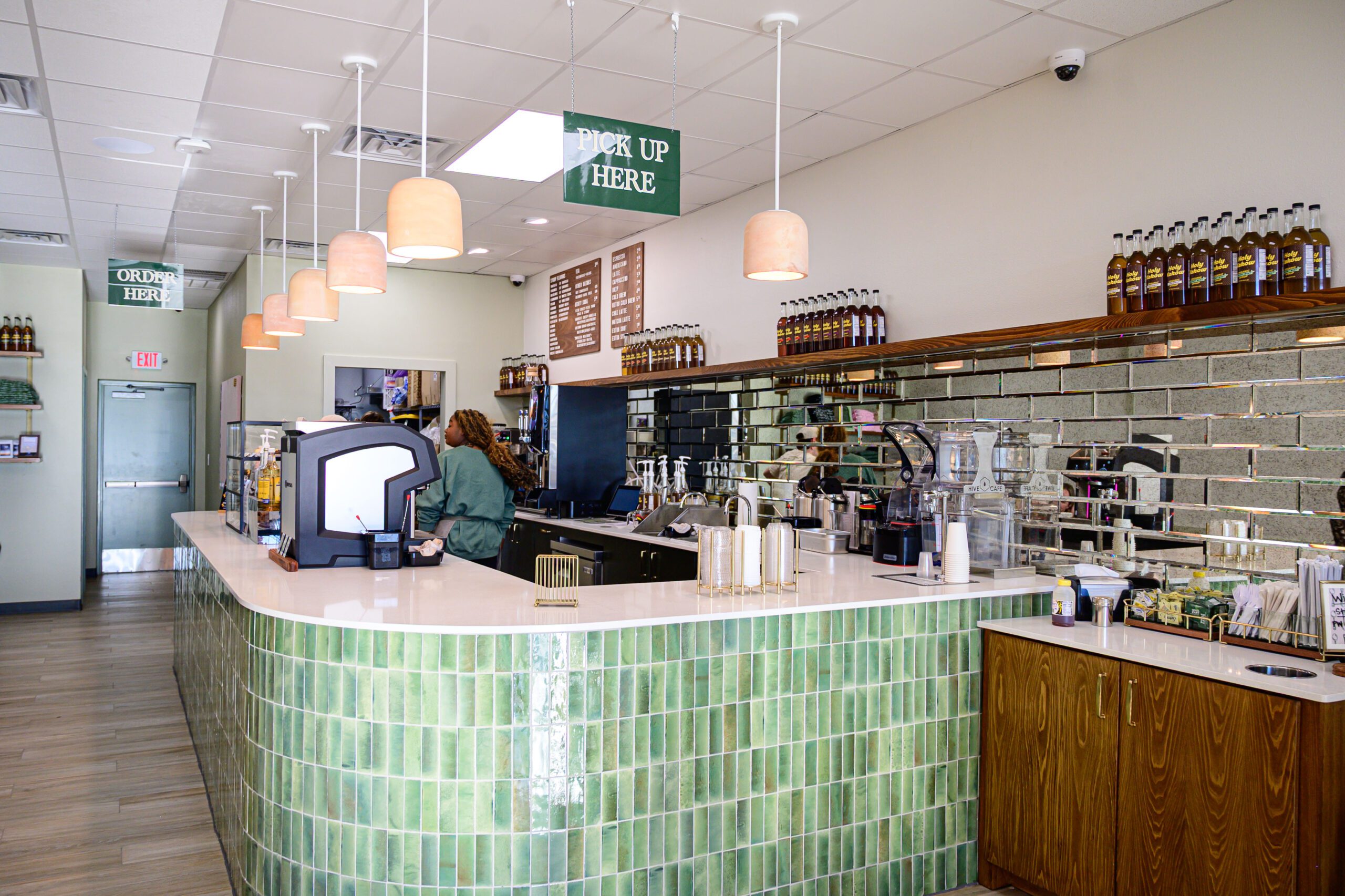 Inside the shop, which was designed by Stefania Gibbens of Gibbens Design, customers will find a comfy, chic aesthetic, with tables and chairs for lounging or working and pops of green from plants scattered about. Green and pink seem to be Stir’s signature hues, with the coffee bar covered in sage tiles backed with a mirrored backsplash, and baby pink hot drink cups.