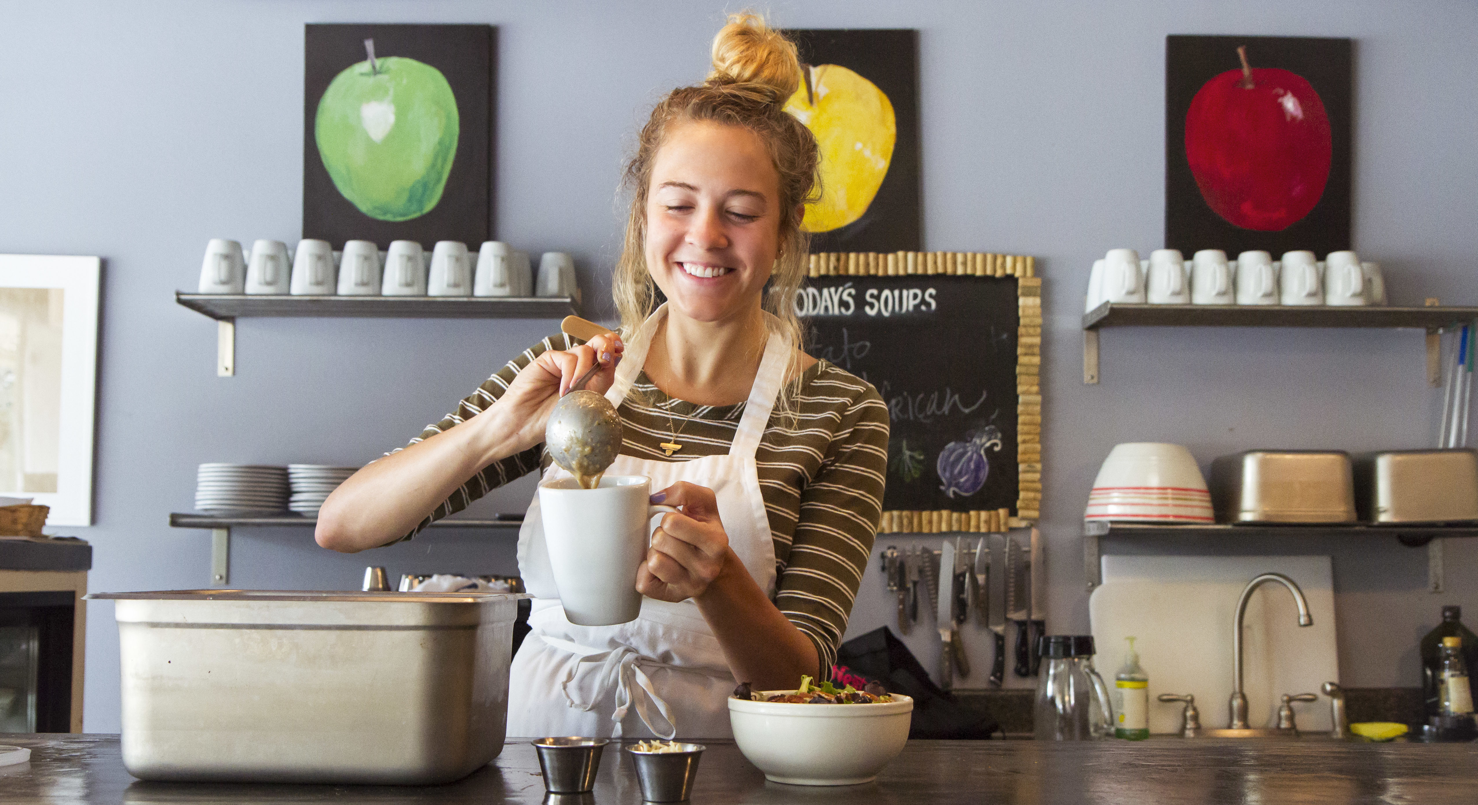 Standing 5 feet 9 inches tall, Faucheux wears a jean skirt, a striped cotton shirt and hiking sandals the day of our interview. Her hair is tousled in a bun, and her blue eyes match her fingernail polish. Between adding colorful vegetables to a crockpot and coordinating window cleaning services for the cafe, Faucheux makes time to talk with us about her plans and menu favorites. She flashes an occasional warm smile as we talk.