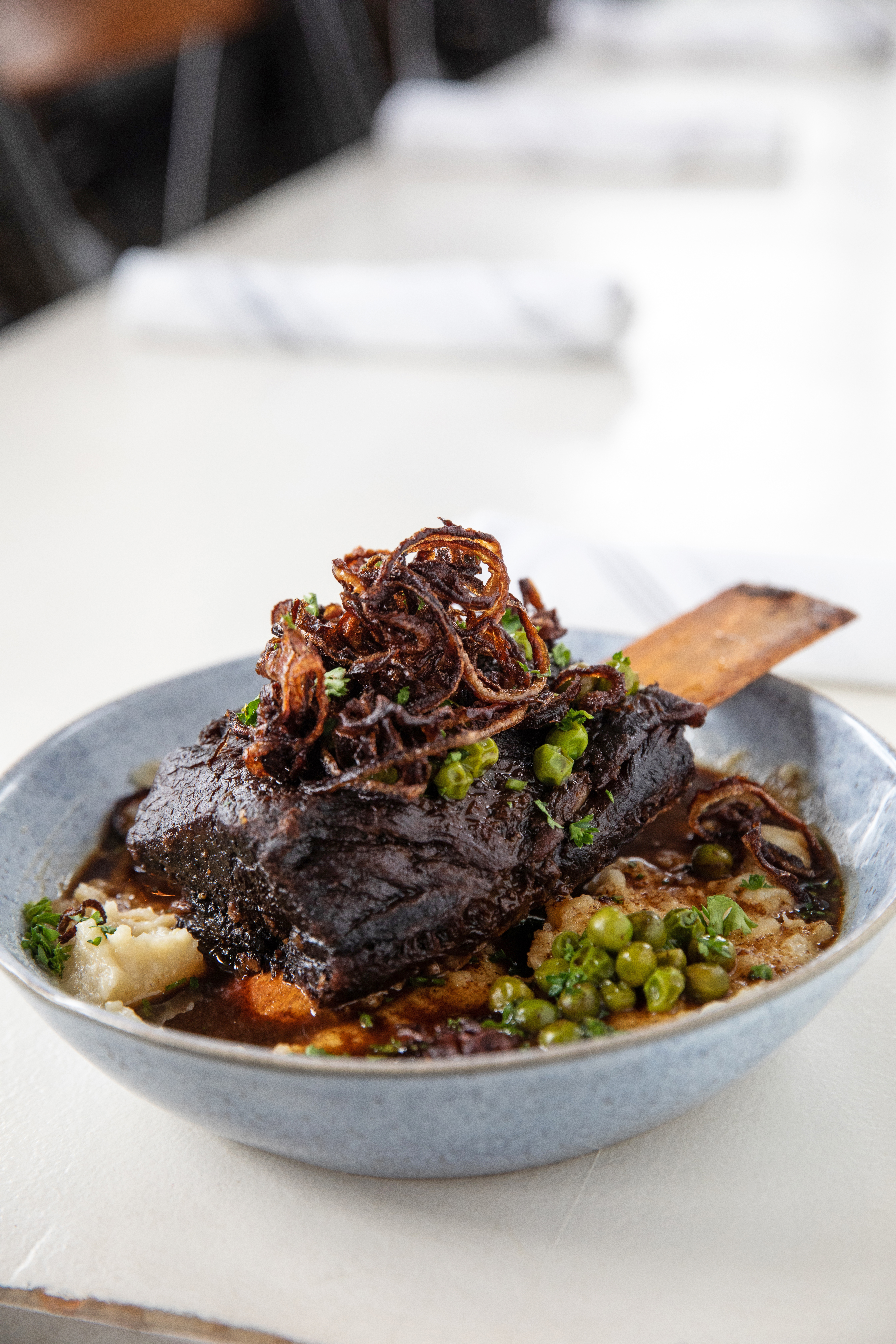 On left: The “Low-n-Slow” short ribs entree is glazed in a root beer reduction.