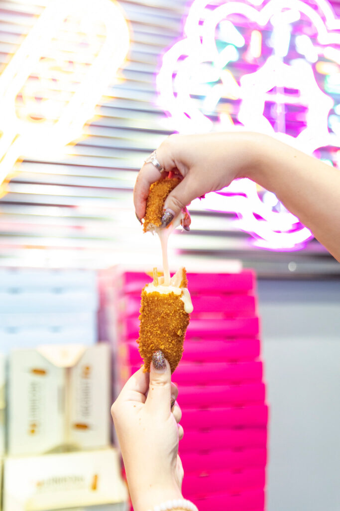 The Korean corn dogs are offered with either hot dog or mozzarella cheese inside. If you can’t decide on your filling, there’s also an option to order half hot dog and half cheese. You can customize your dog further by getting it rolled in potato pieces, crushed ramen noodles, hot Cheetos or rice cereal.
