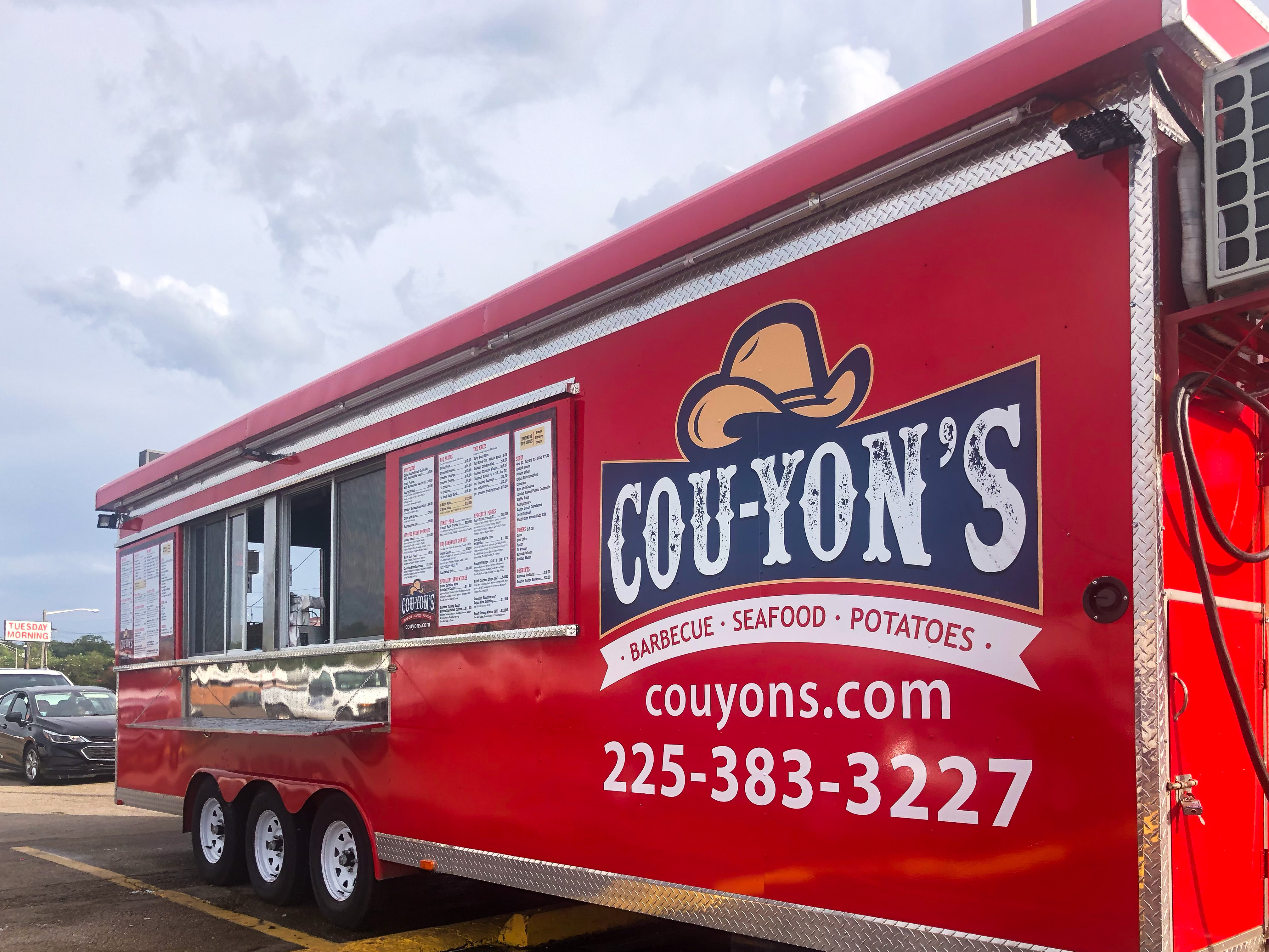 Though the food trailer’s menu is smaller than the original restaurant’s, it still includes a variety of appetizers and sides, sandwiches, barbecue plates and several specialty dishes. Loaded baked potatoes and baby-back ribs have been in especially high demand. Cou-Yon’s sells an average of 10,000 baked potatoes a month prior to the new location.