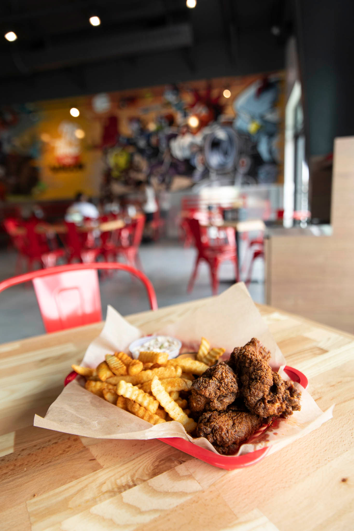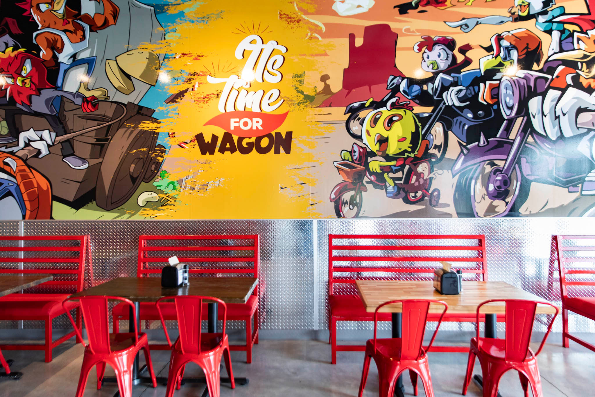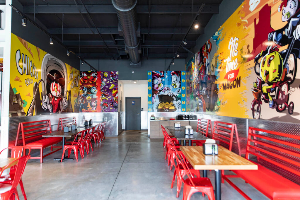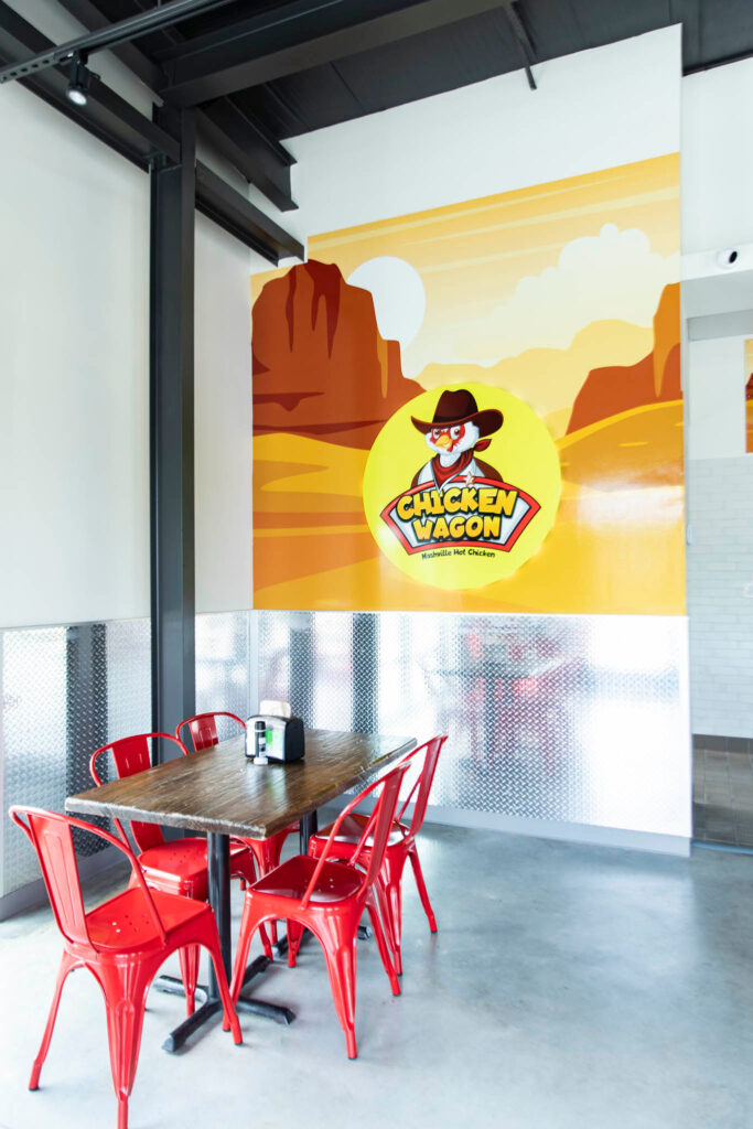 The Staring Lane space is lively and bold, outfitted with a large wall covering featuring original art created specifically for Chicken Wagon. The colorful imagery feels like a fusion of Looney Tunes and Mad Max, with its signature cowboy hat-clad chicken surrounded by wagon carts, motorcycles and bold splashes of reds, browns, yellows and blues. Badawi says the wagon is a nod to his family’s Middle Eastern heritage and references street vendors that sell chicken by the cart. He’s also a motorcycle enthusiast, hence the bikes.