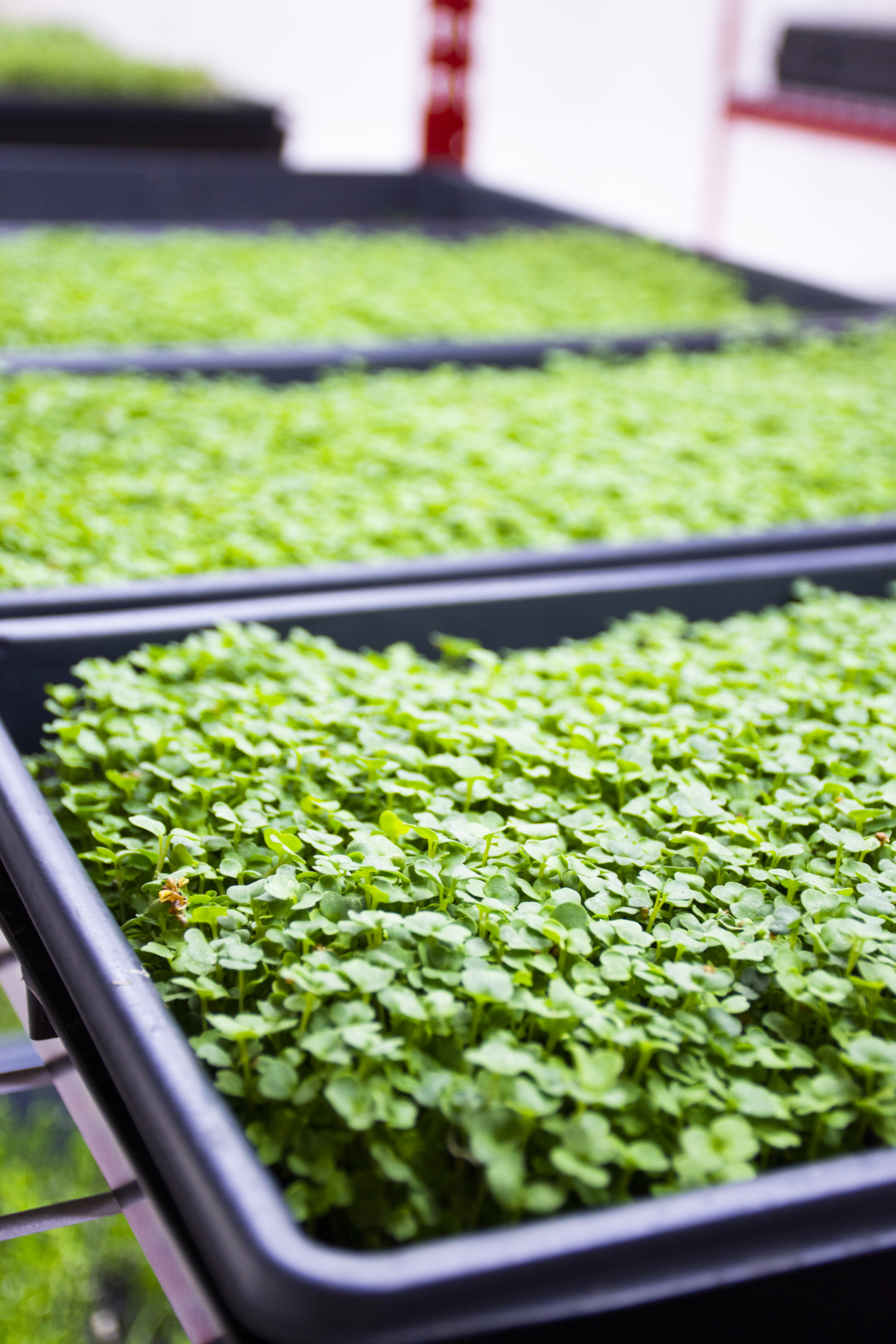 The products range from micro kale to radish shoots to amaranth. Each tray is germinated in covered cases, and then grown for about seven to 14 days before being harvested and packaged. The room is kept warm, and the water used for the plants filtered before use.