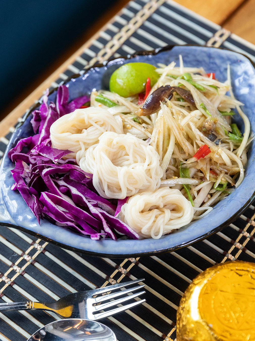 There’s also classic Thai green papaya salad, a great example of the range of sweet, spicy, bitter and sour flavors that characterize Thai cuisine.
