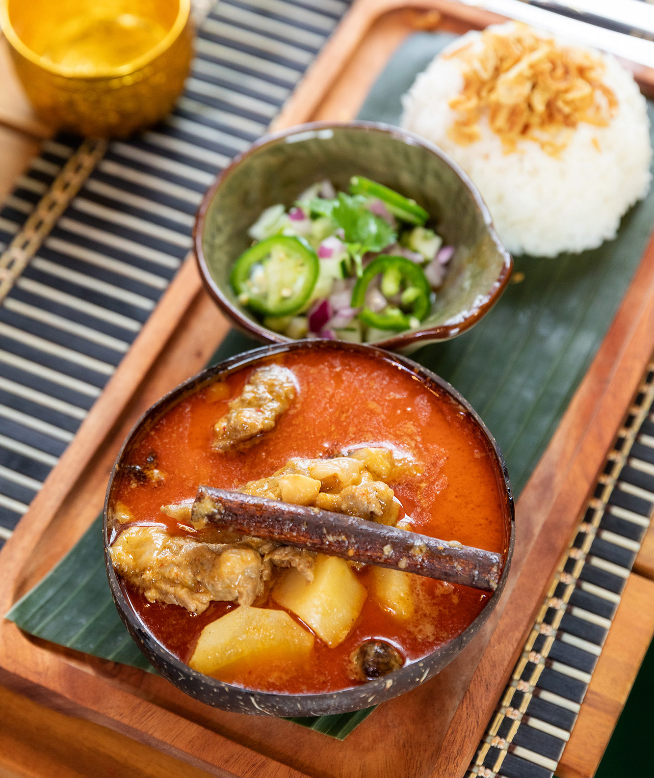 Green curry crispy wings are a great place to start, as is classic tomyum soup, a sweet and sour bowl fragrant with lemongrass, fiery chiles and plump shrimp.