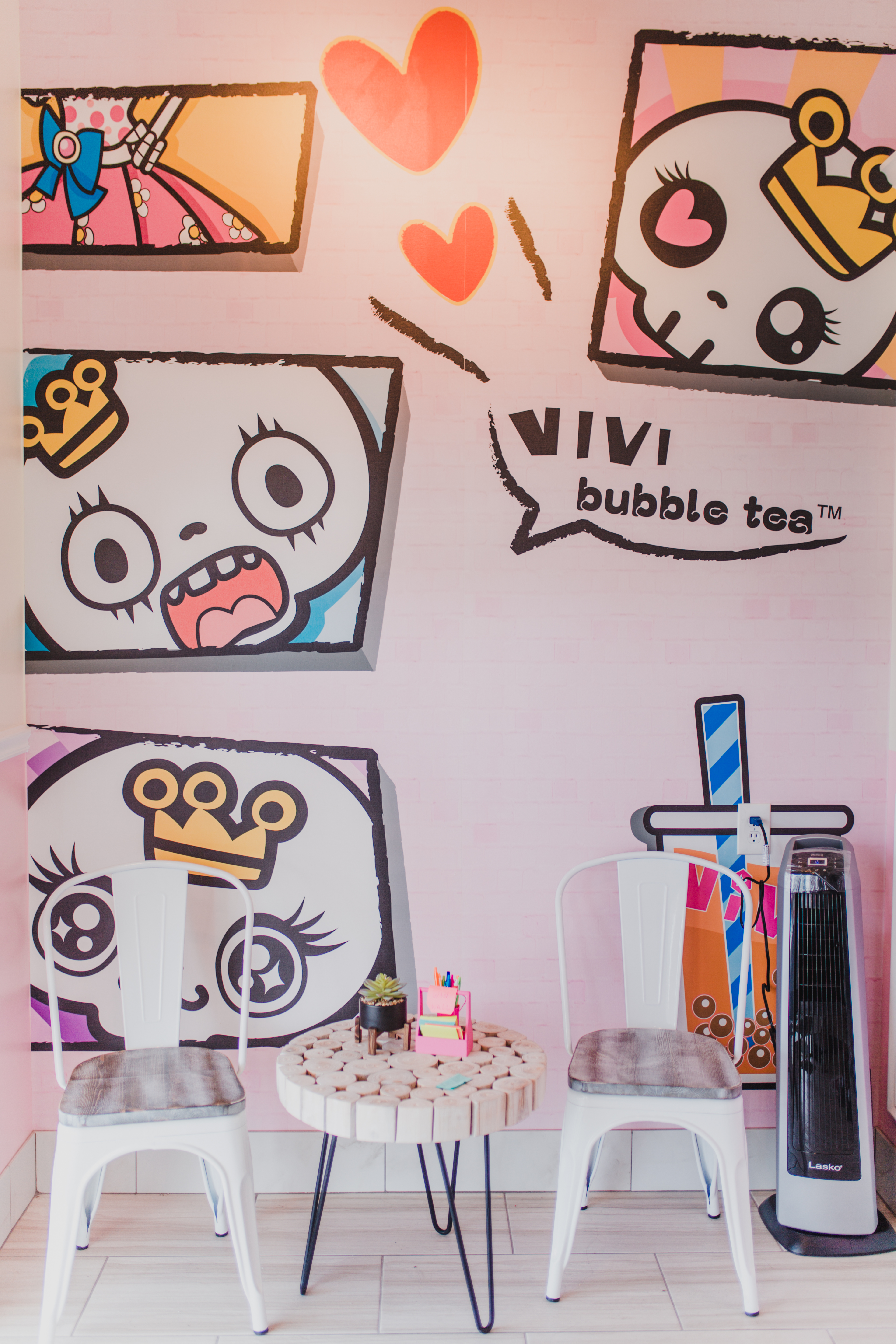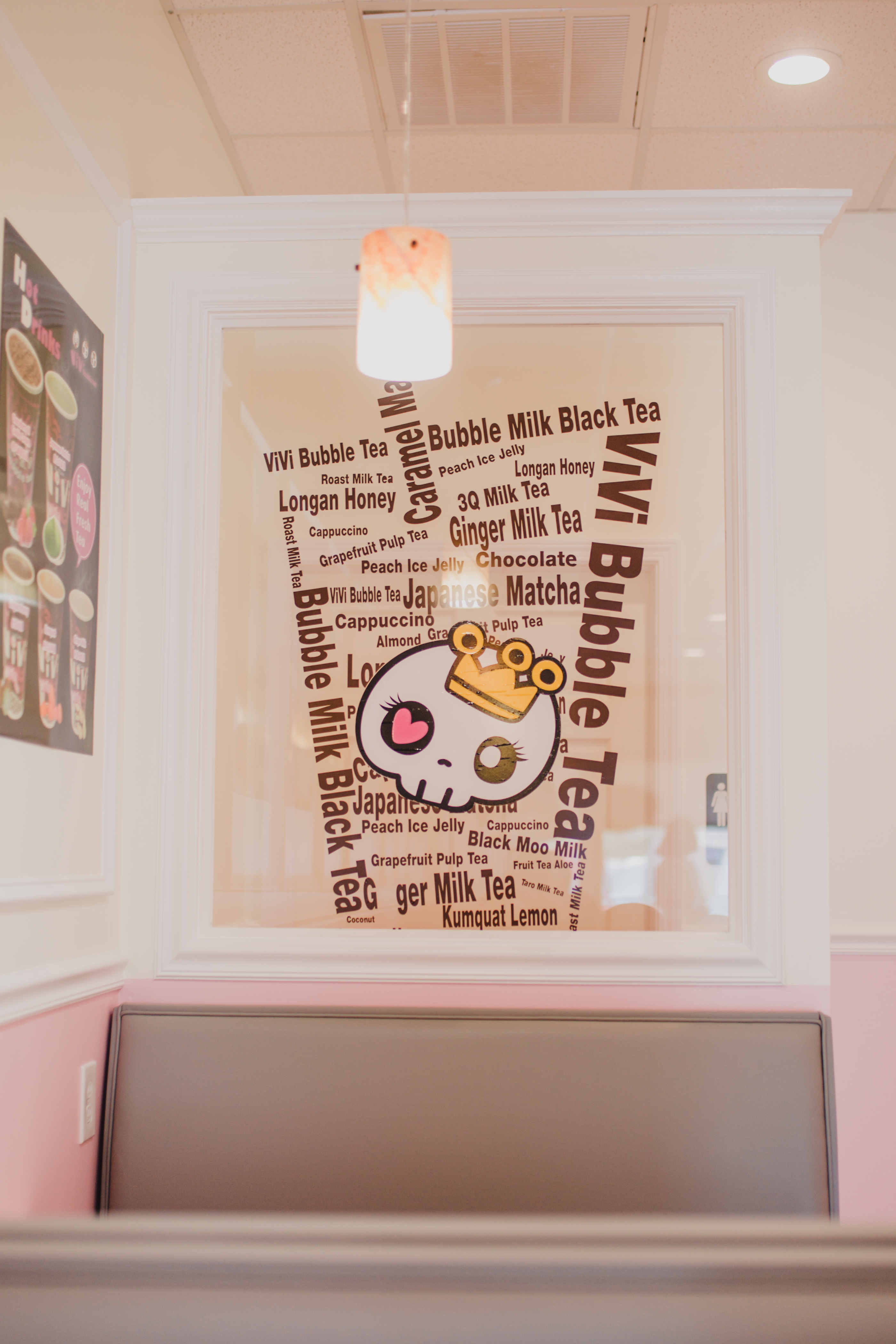 The walls of the shop’s interior are painted off-white and pastel pink with images of Vivi’s icons—animated skeletons wearing crowns—a fitting staple of Vivi locations throughout the country. A few booths line the wall opposite the counter.