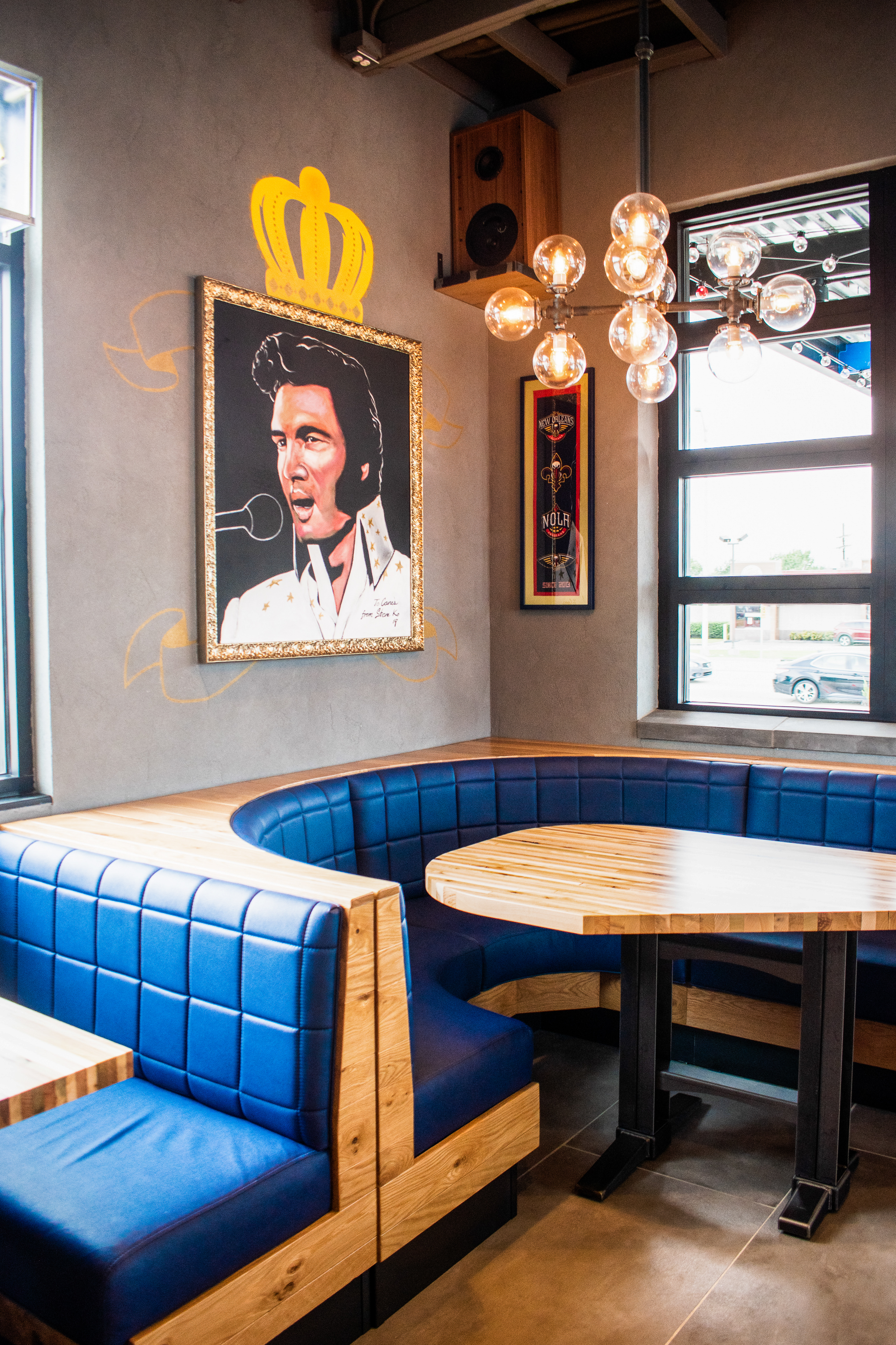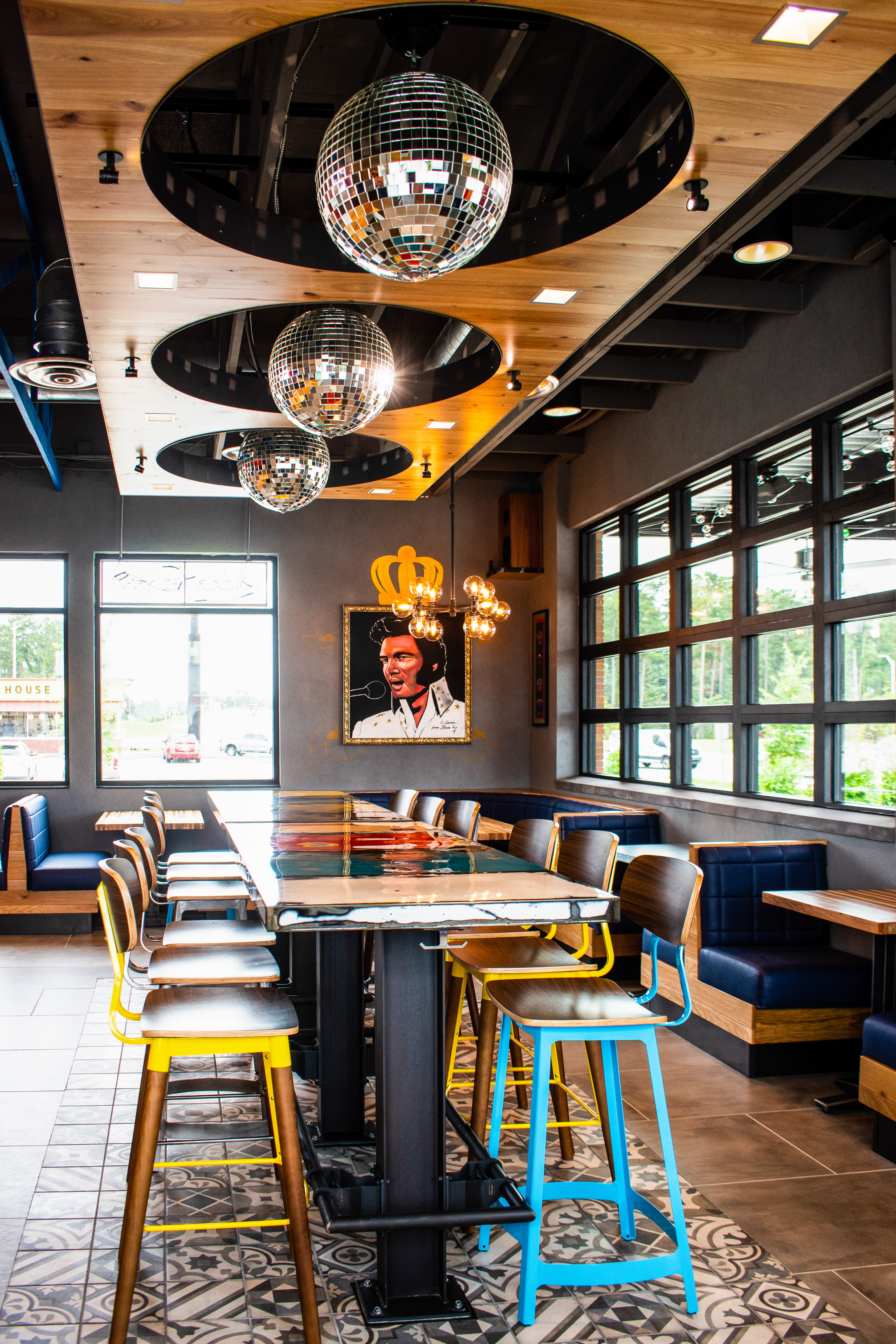 But don’t wave goodbye to your favorite classic Cane’s features—several of those such features are incorporated in the new design as a testament to the company’s journey. Retro speakers play music from the corners, and there’s a velvet Elvis hanging on the wall—a callback to the Elvis towel hanging in the original restaurant at LSU’s north gates. And you can’t miss the three disco balls hanging front and center, also a tribute to the original location, which has a disco ball hanging from the skylight. Since that first restaurant, the disco ball has become a staple in all Raising Cane’s restaurants and offices. “The restaurant is focused on telling our story, but kind of in a new and updated way,” says Raising Cane’s spokeswoman Julie Perrault.