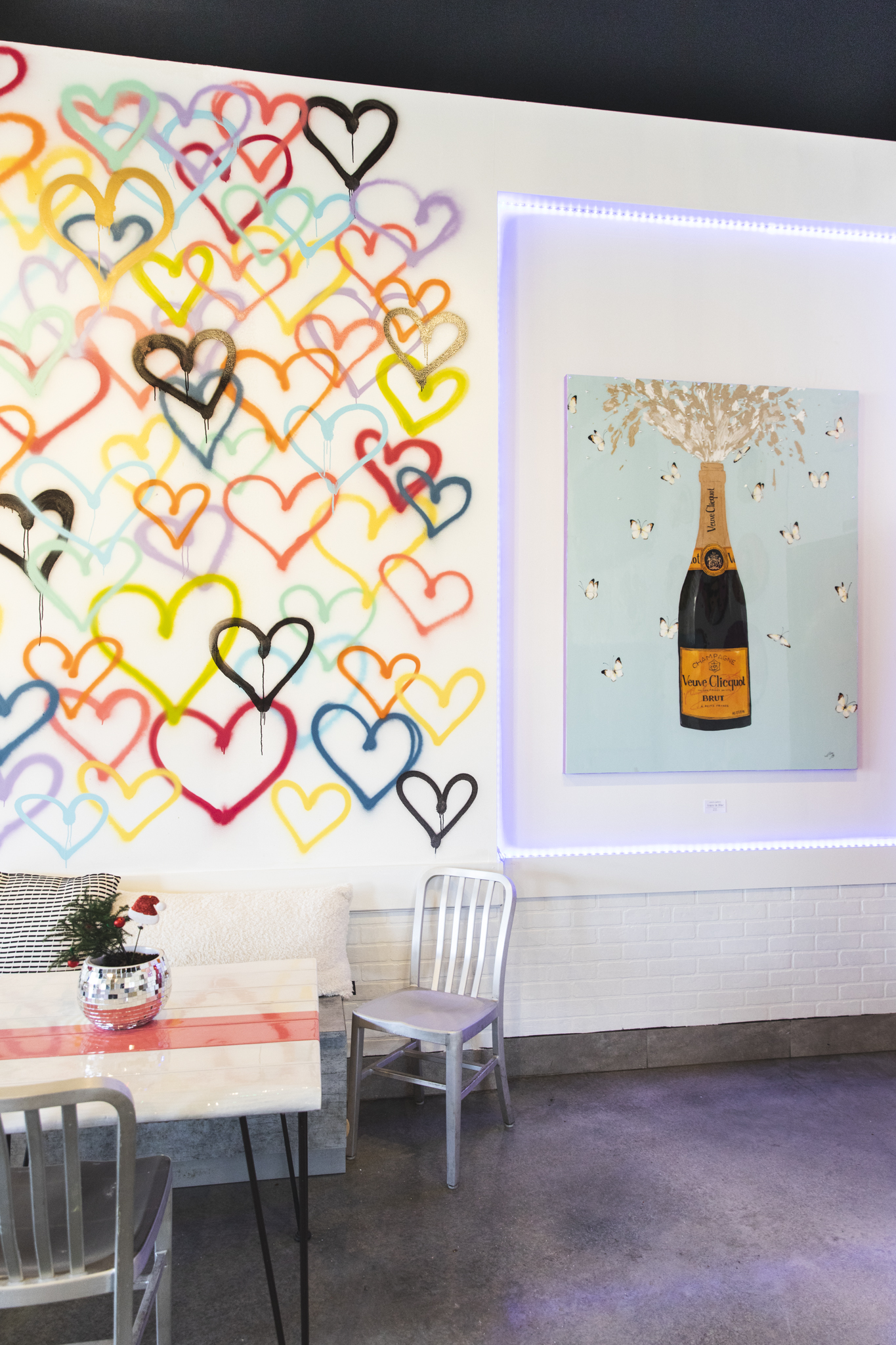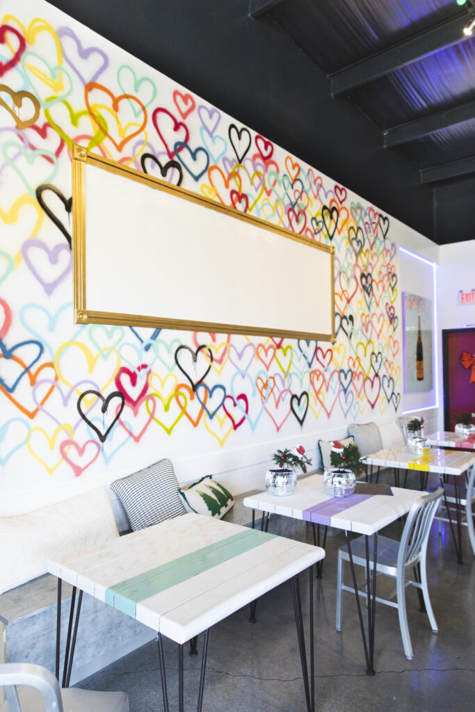 The vibe is lively, helped along by a main wall awash in spray-painted hearts in bright colors painted by Schmidt and local artist Cora Barhorst of Cora B. Gallery.