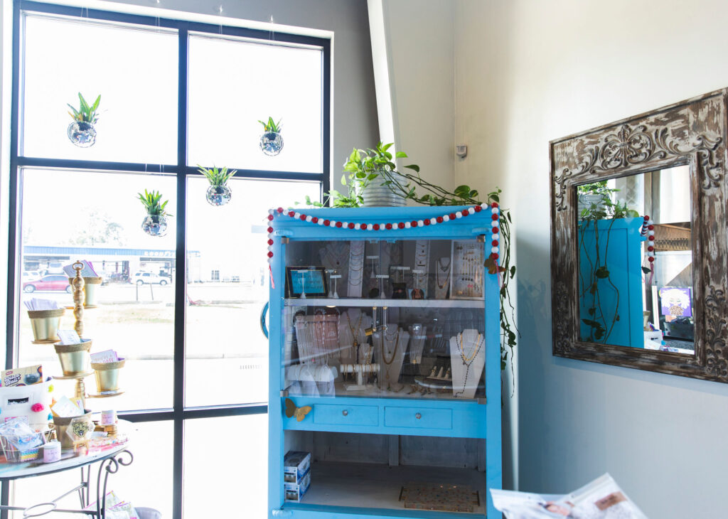 “I wanted to create a space that’s fun and happy and different from what you normally see in Baton Rouge,” she says. “That’s how I chose the bright color theme, and I have a lot of local artists on the walls, and for sale, because I love local art.”