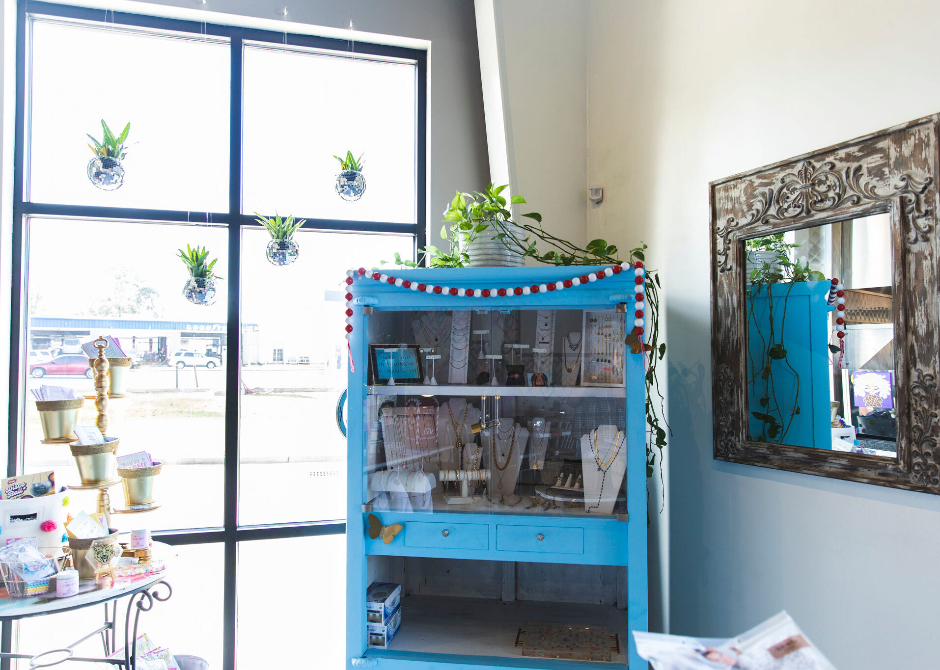 Displays in the entrance hold small gifts like bath bombs, candles, funny cards, Baton Rouge-made Drip Jewelry and small “designer girls” prints by local artist Melissa Troxell. Barhorst’s portraits musicians and singers from her “Icons & Idols” series and a large Champagne painting on the walls are all for sale, as well.
