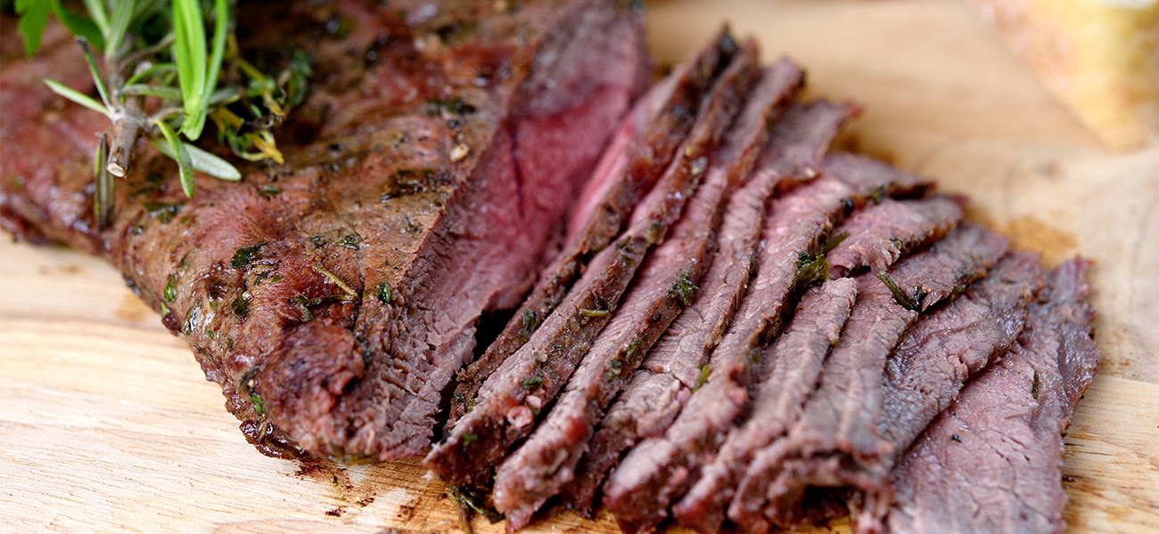 Flat iron steak is a flavorful cut of beef that’s great on the grill. It is best served thinly sliced and can be enjoyed in a number of ways. The herb mixture in this recipe is an easy marinade that enhances the flavor. Bring the steak to room temperature before grilling to make sure it cooks evenly. Because it’s a lean piece of meat, make sure not to overcook it, and to let it rest at least 10 minutes before slicing.
