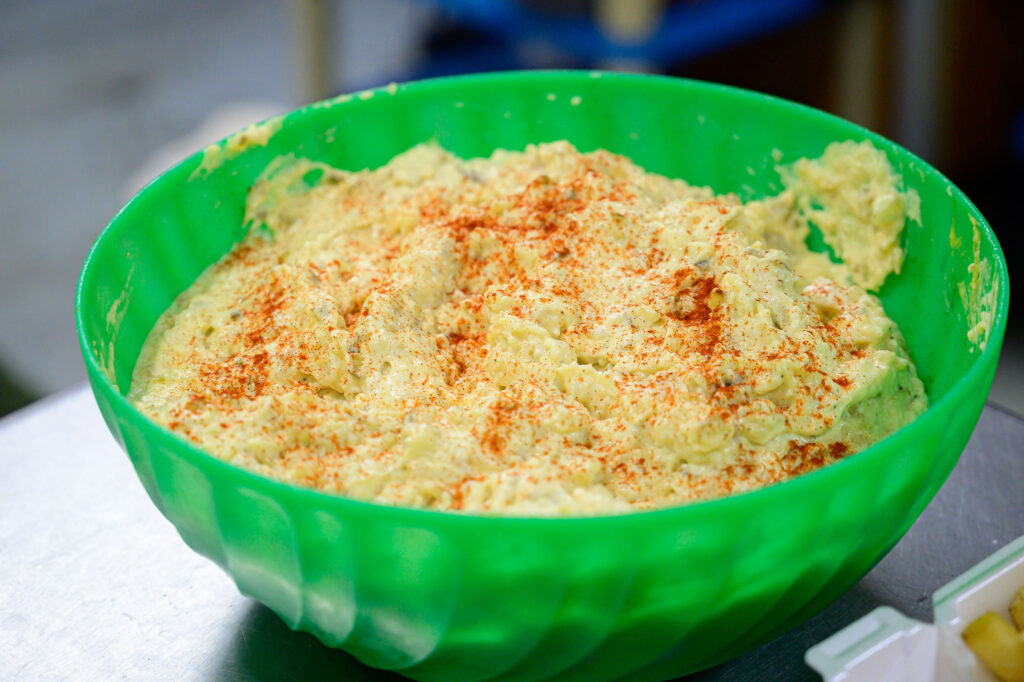 Green takes orders by writing them on the outside of each Styrofoam clamshell, then filling it accordingly. After a few orders, she peels off the pair of latex gloves she’s been wearing, tossing it deftly across the room into an open trash can about 15 feet away. She heads to the kitchen to retrieve the pigtails, then dons a new pair of gloves before serving again. Meanwhile, the landline is ringing off the hook. Diners ask what’s on today’s menu, and the old-school front door bell chimes with entering patrons.