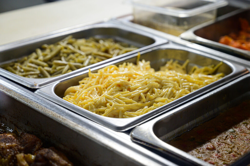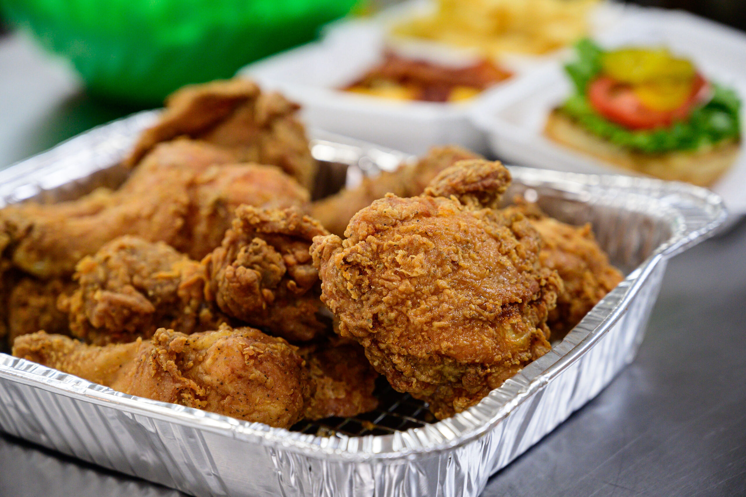 Mac and cheese made with spaghetti, not elbow noodles; soft sweet peas; tender stewed cabbage; collard greens and candied yams are among the regular sides. Plump cornbread muffins rest in a separate pan, each a final adornment to a completed to-go box.