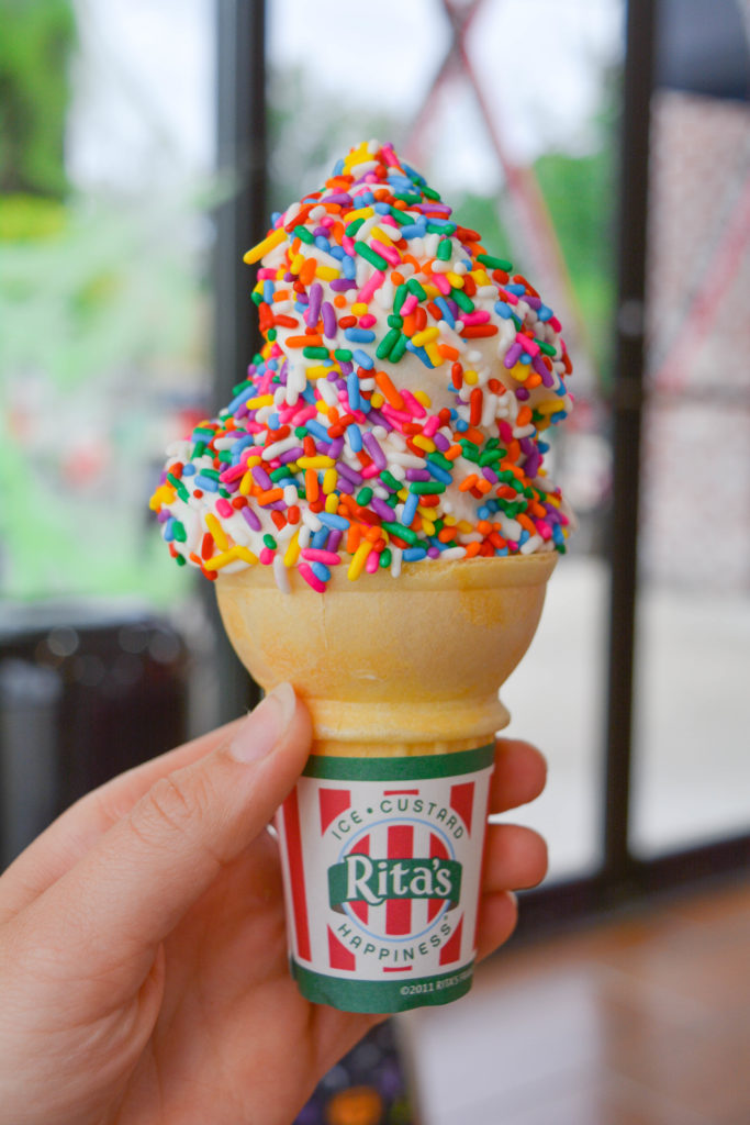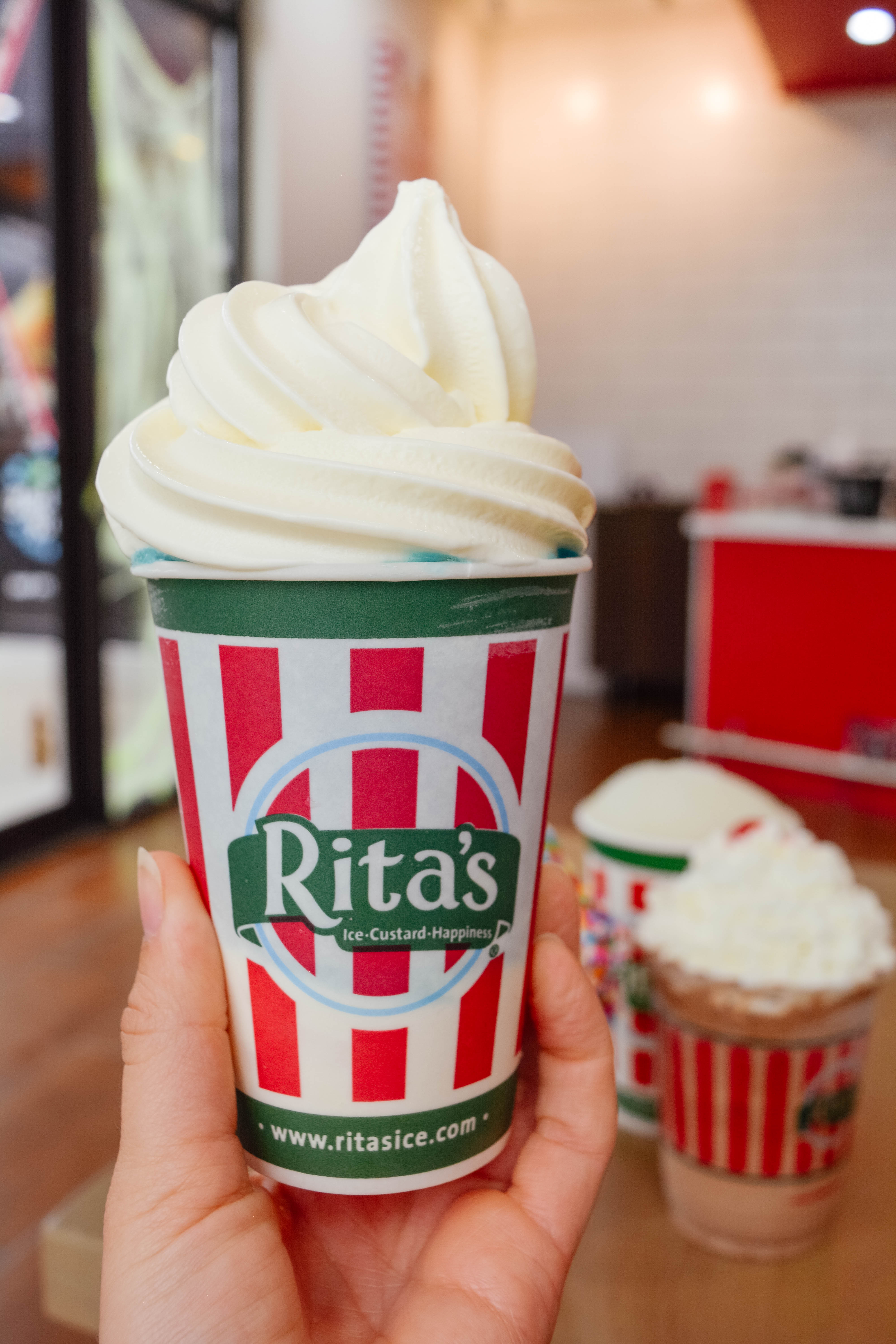 First, there’s the classic Italian ice, a water-based offering. The mango and cotton candy flavors are most popular. Then, there’s the second Rita’s essential: the frozen soft-serve custard, made in house and hand scooped. The custard starts with a vanilla base, and toppings are then folded in to form your favorite flavor.