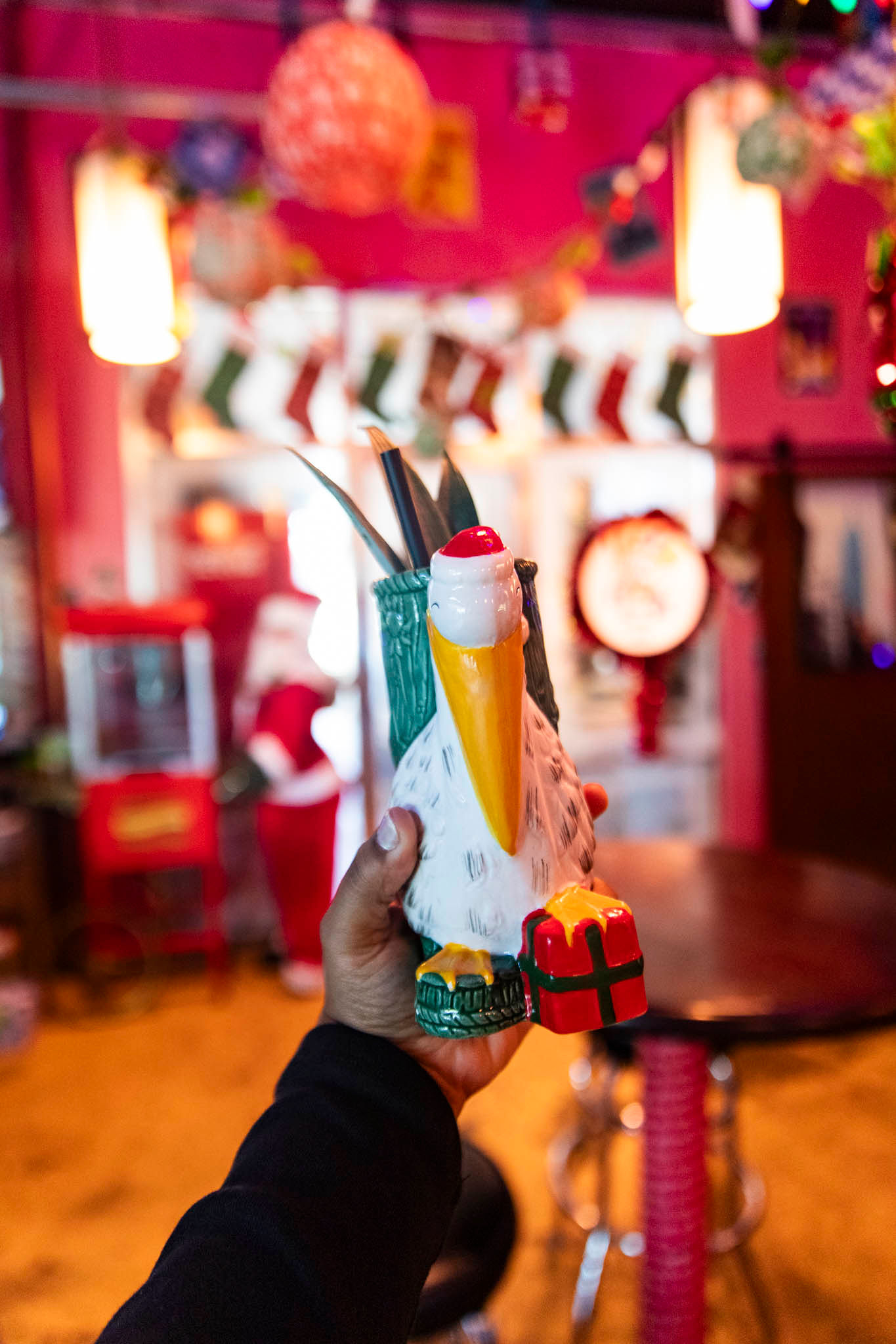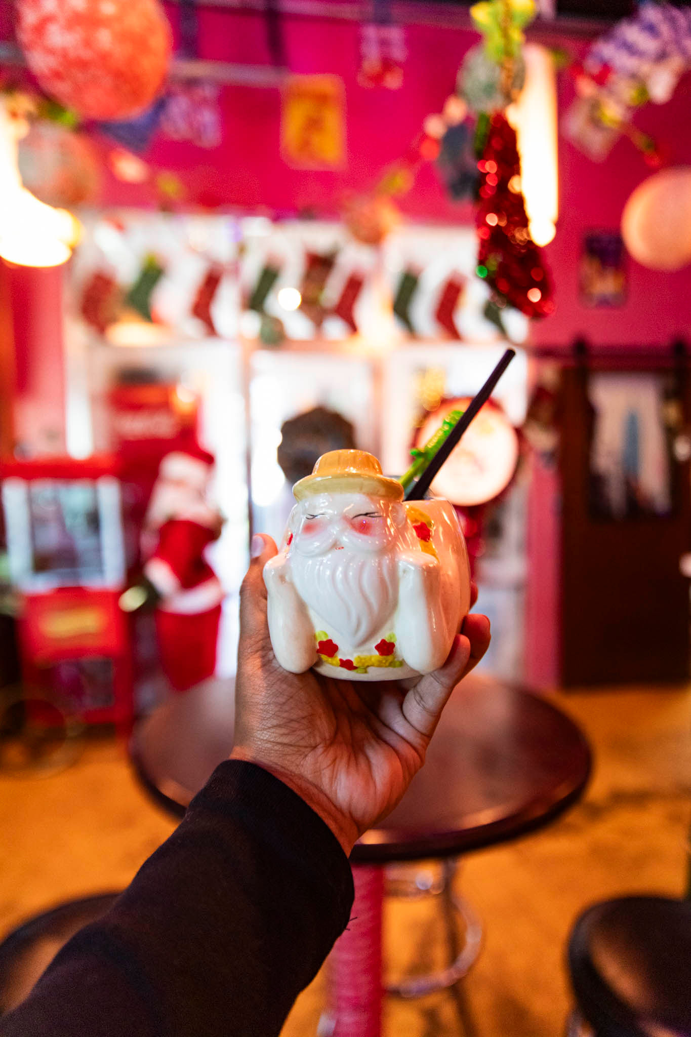 Forget tacky sweaters and hot cocoa mugs. Say “aloha” to Hawaiian shirts and tiki glasses at Sippin’ Santa, the tropical-themed holiday pop-up at Pelican to Mars.