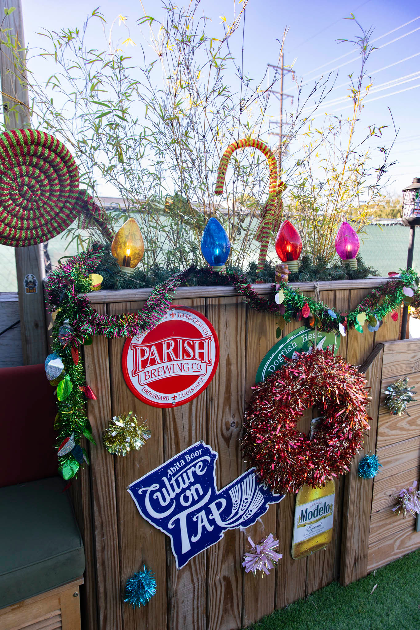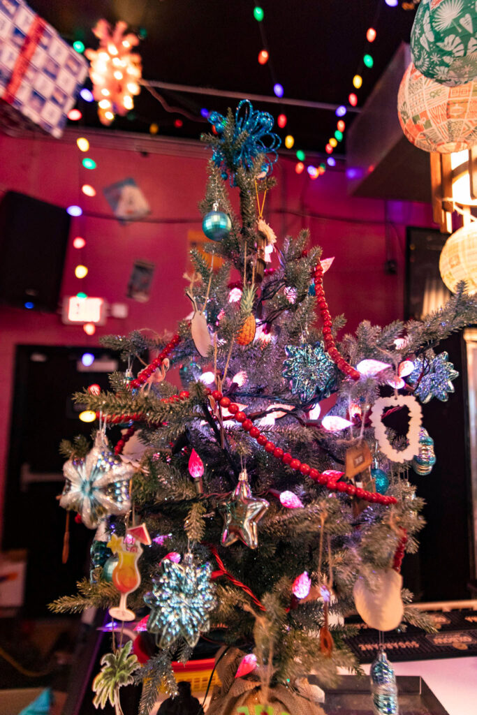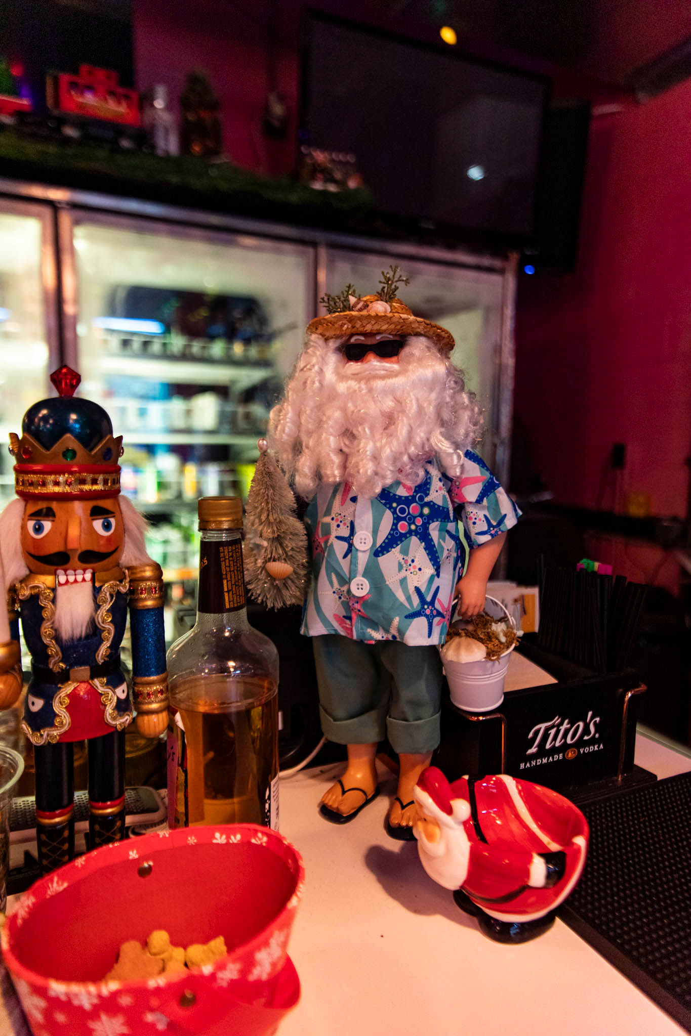 The Government Street bar has been tied up in tinsel and transformed into a bit of a winter wonderland, and Paddock says he and his team are still decorating the space to get it just right. Inside, find nutcrackers, beach-going Santa figurines, decorated trees, wreaths, big red bows, paper lanterns hanging from the ceiling and other festive decor. Items were sourced from stores, personal collections, the Sippin’ Santa startup kit and even old movie sets. Paddock says he hopes to take decorations up a notch each year.